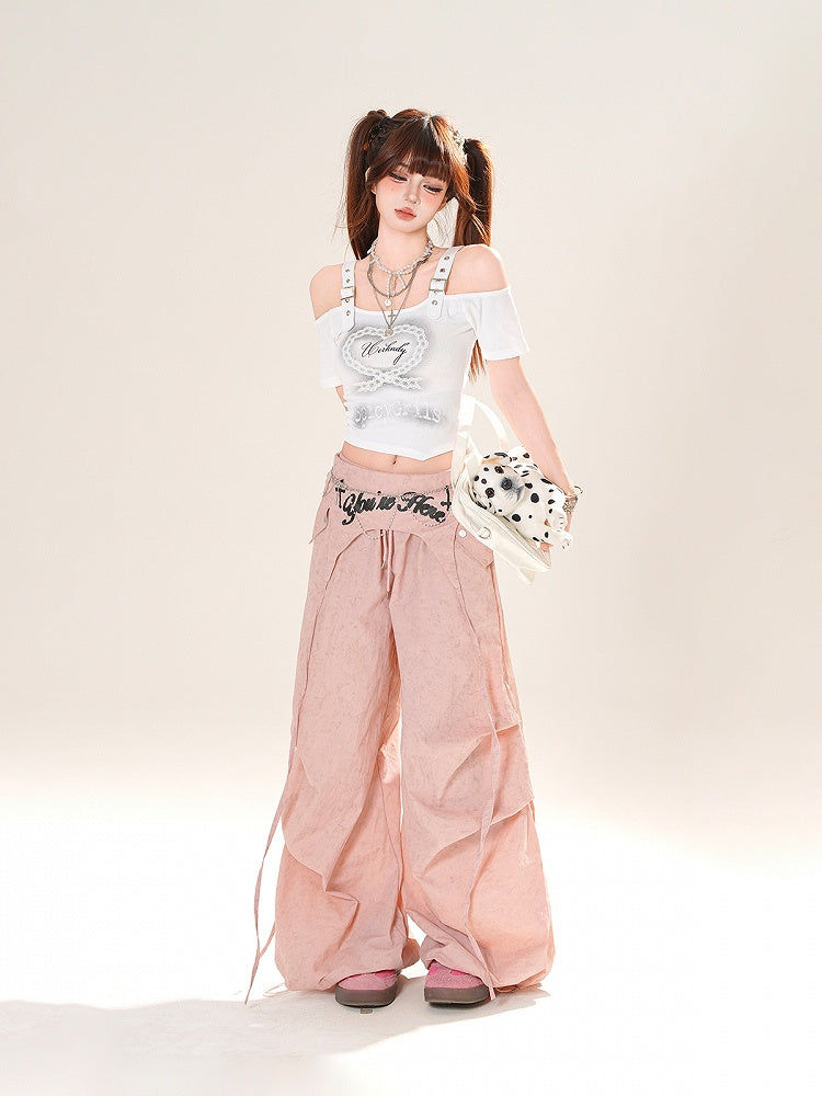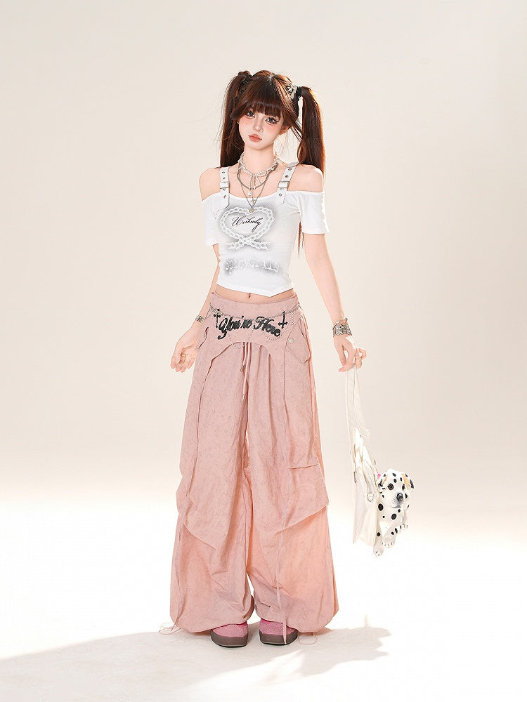 ネックライン ハートプリント クロップド オフショルダー Tシャツ ホワイト