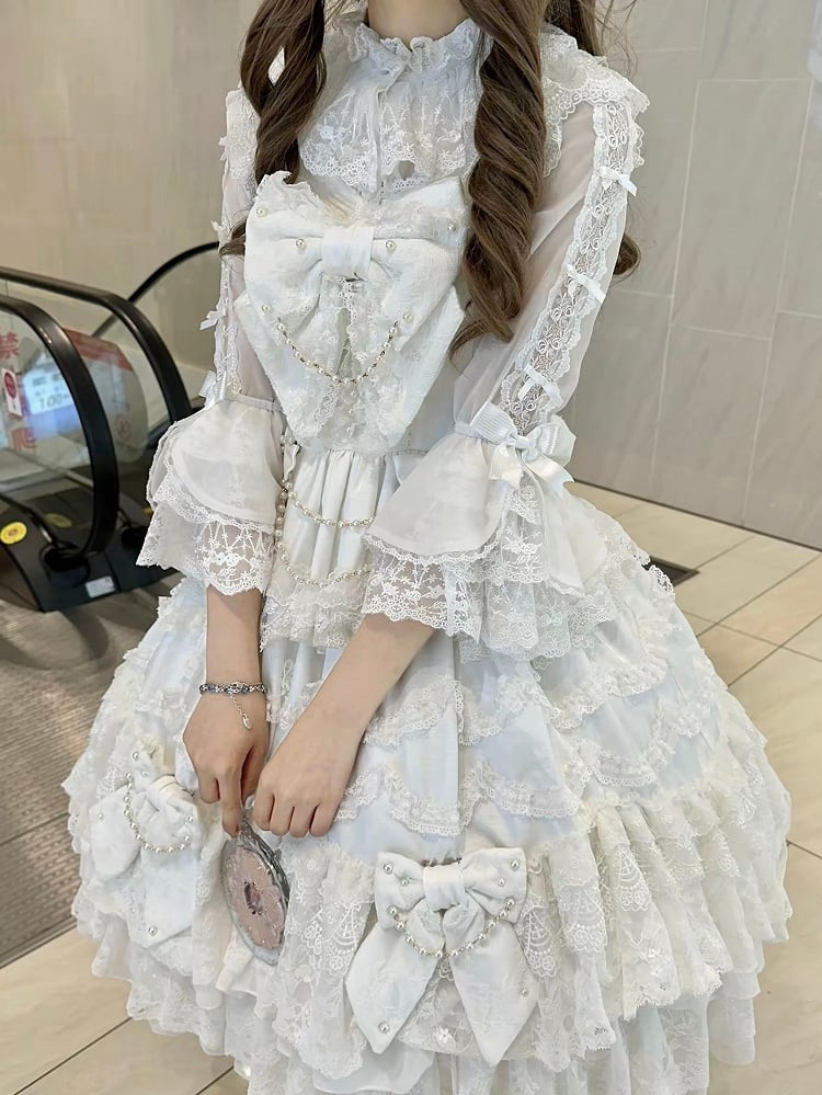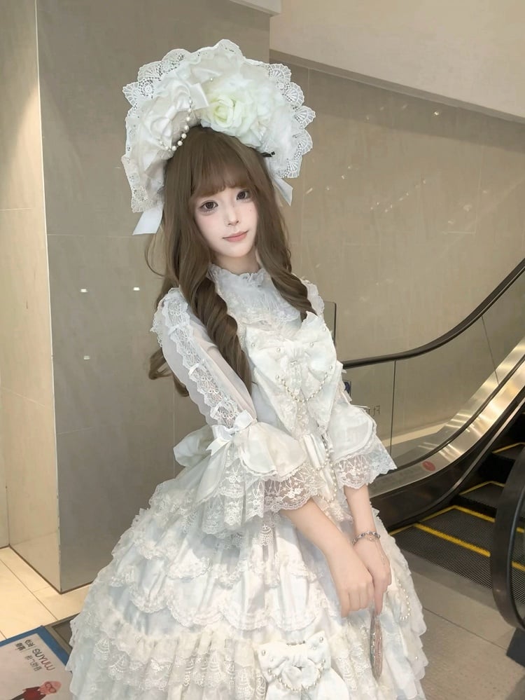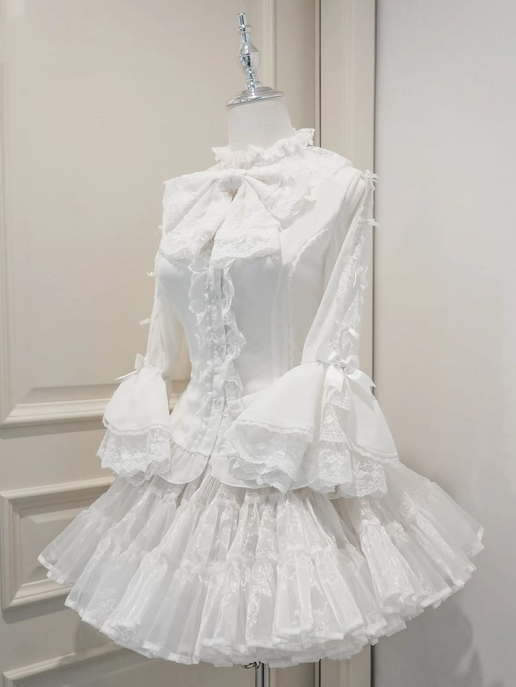 ホワイトのフリルネックライン、小さなリボンが飾られた7/4スリーブのロリータシャツ