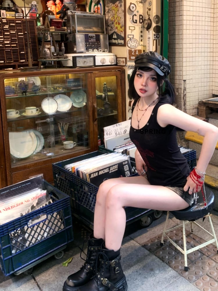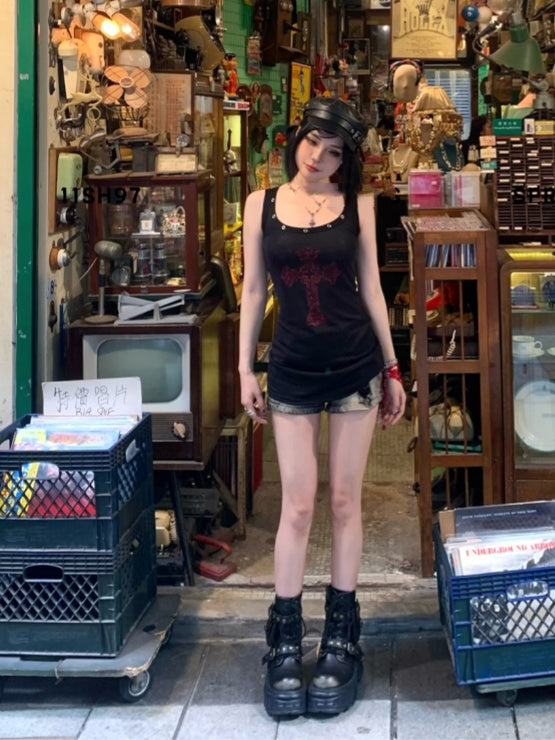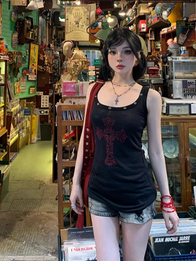 ブラックのスクープネックライン、クロスプリントのグラマラスタンクトップ
