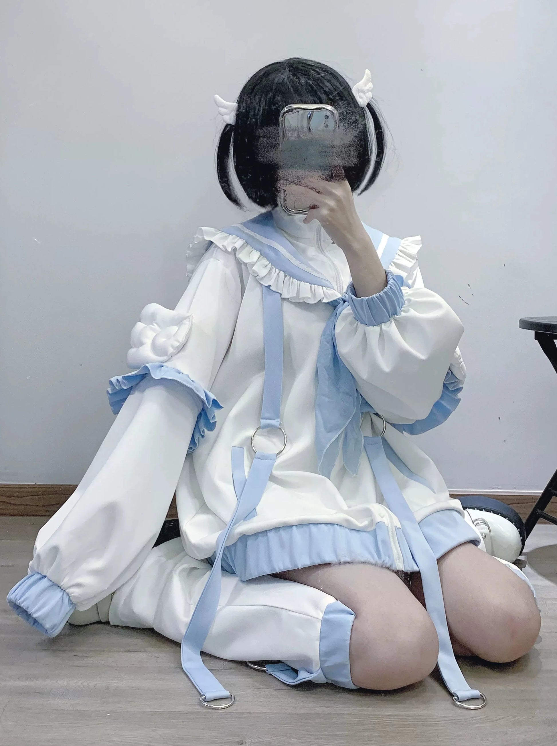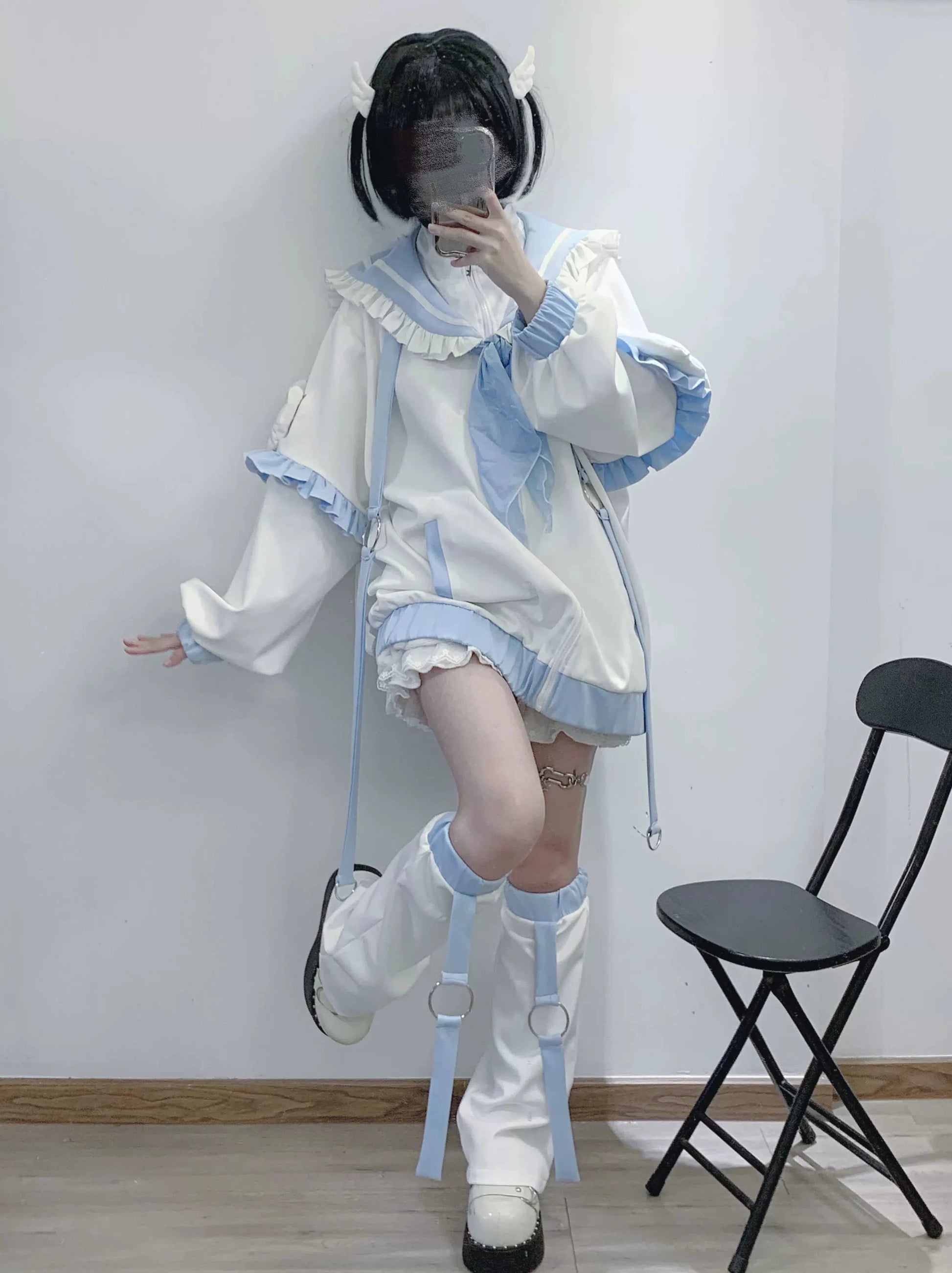 青と白のオールドスクールロリータファッションドレス 蝶結びディテール JSK セット