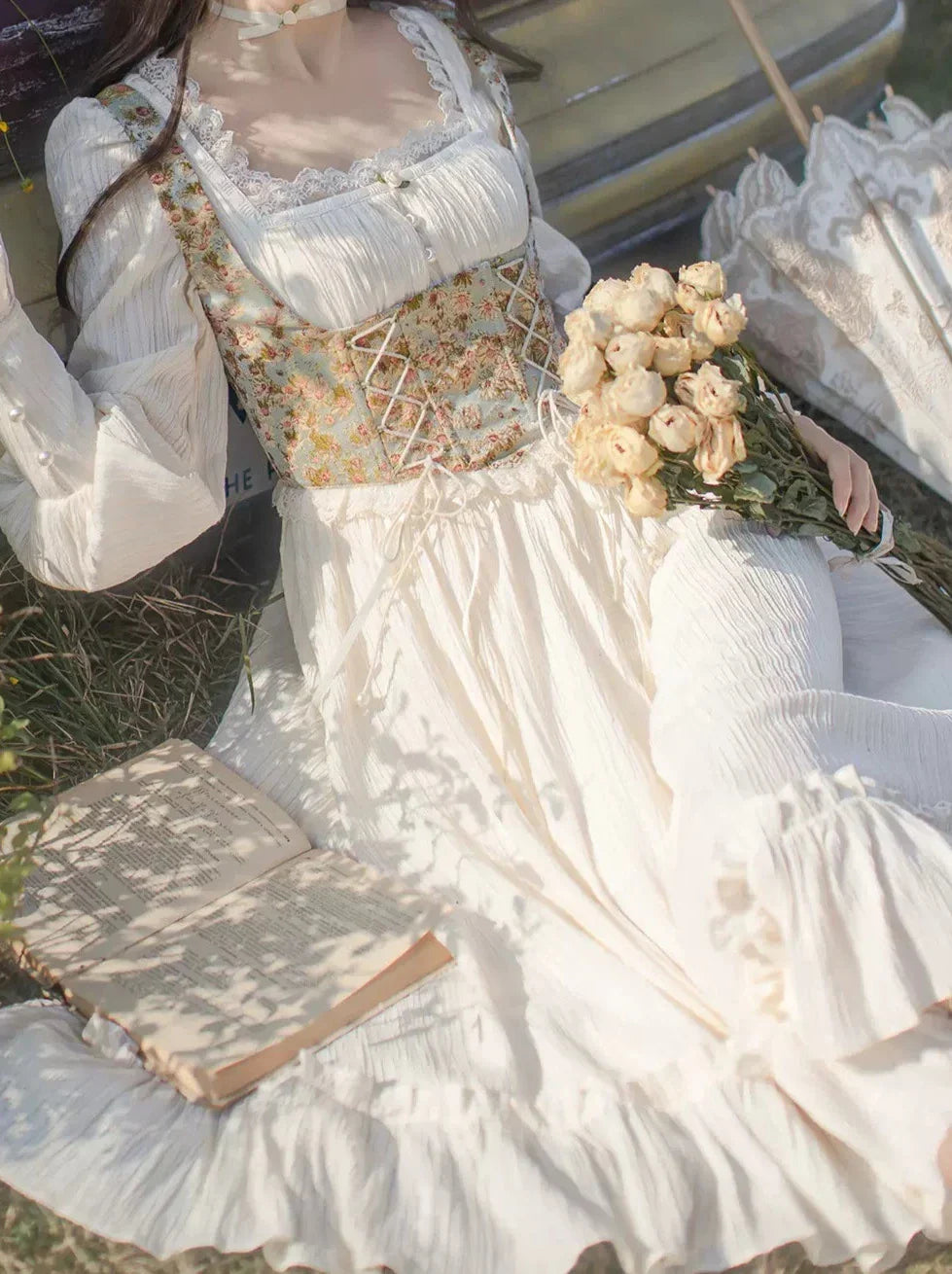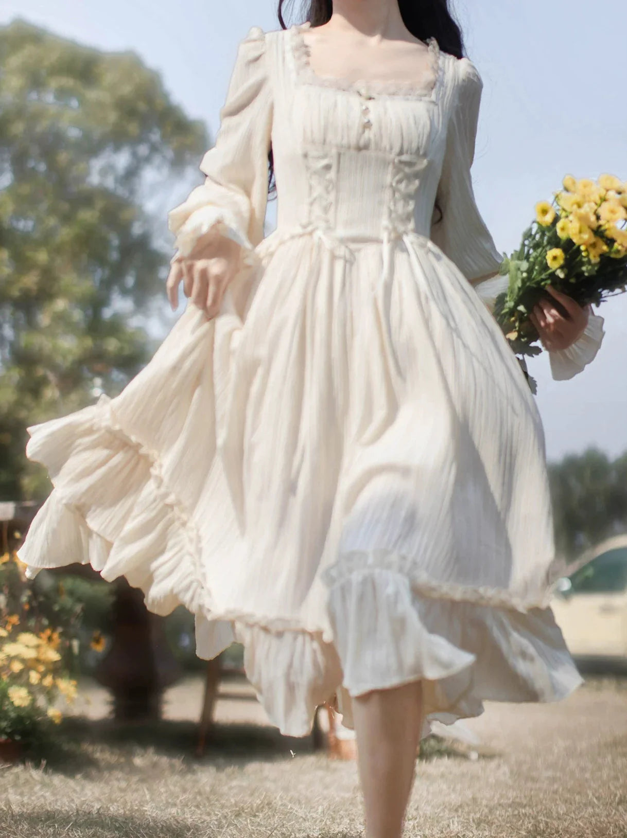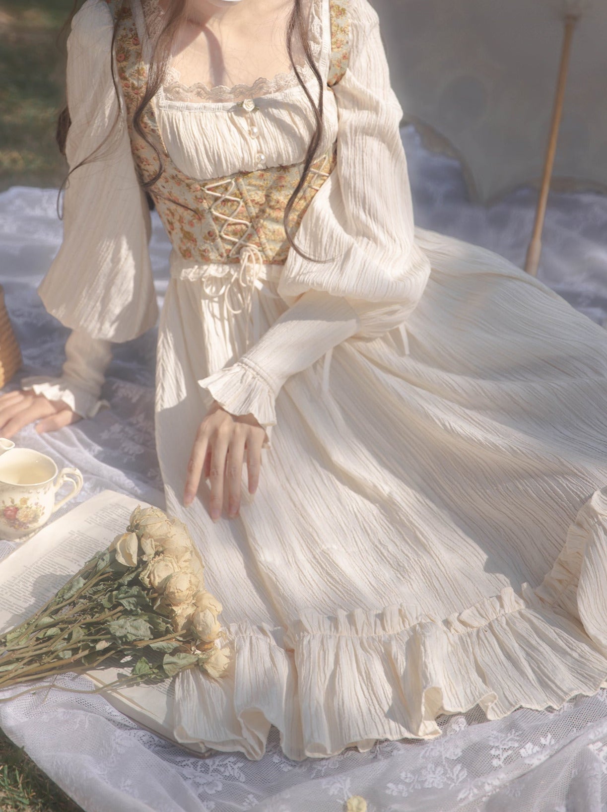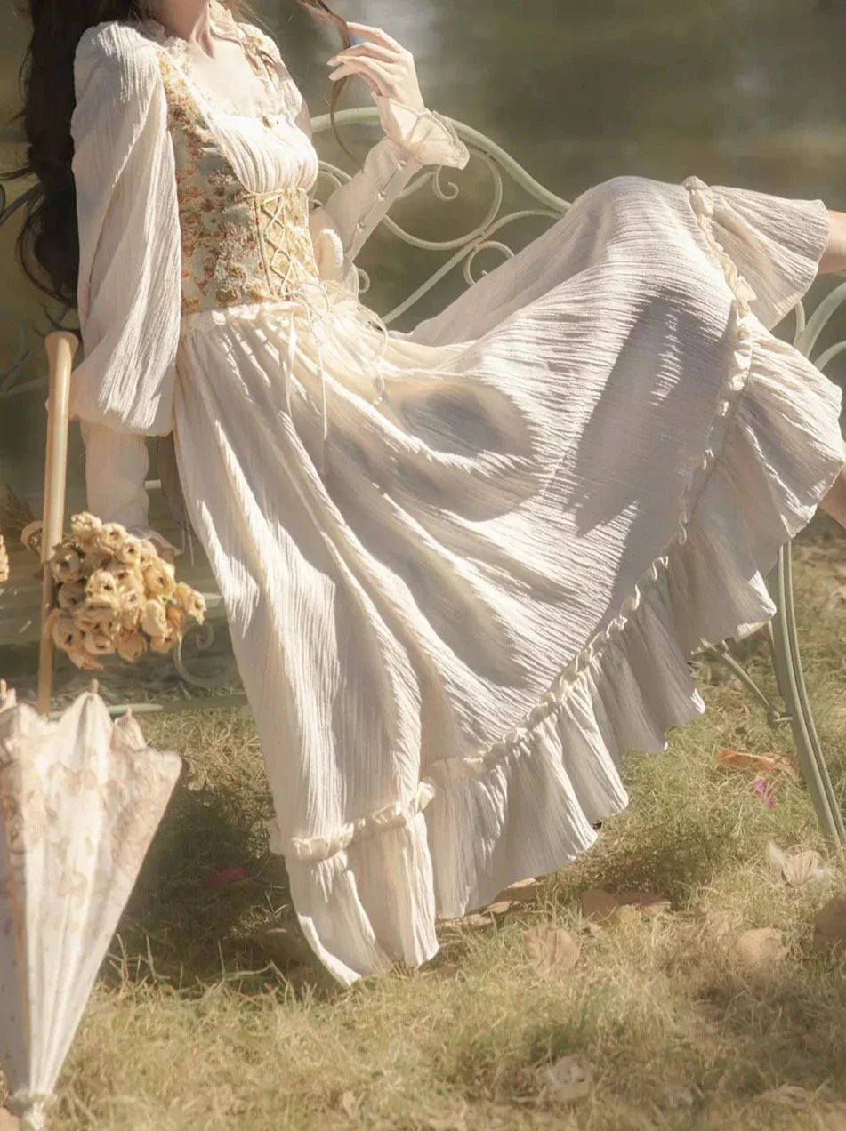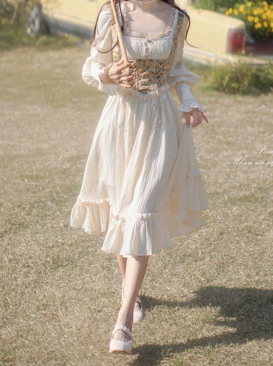 オイルネックのスクエアフラワーとペイントフレンチビスチェを組み合わせたユニークなデザインが特徴のドレスです。どんなシーンにも合わせやすい、愛らしく魅力的な装いを演出します。
