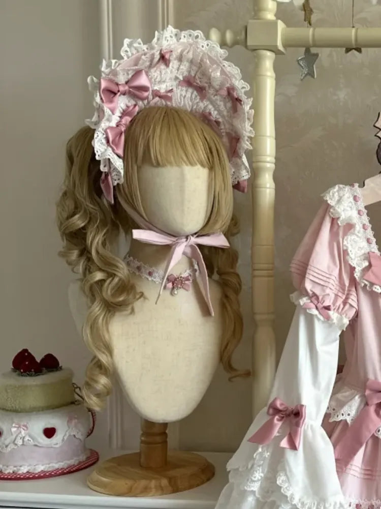 白とピンクのオールドスクールロリータボンネット/チョーカー
