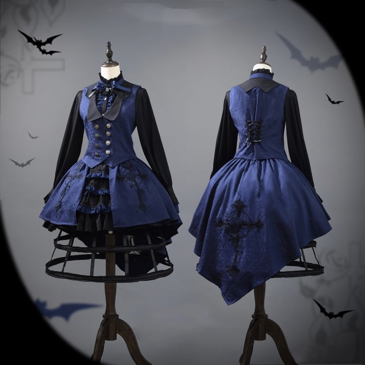 青と白のオールドスクールロリータファッションドレス 蝶結びディテール JSK セット