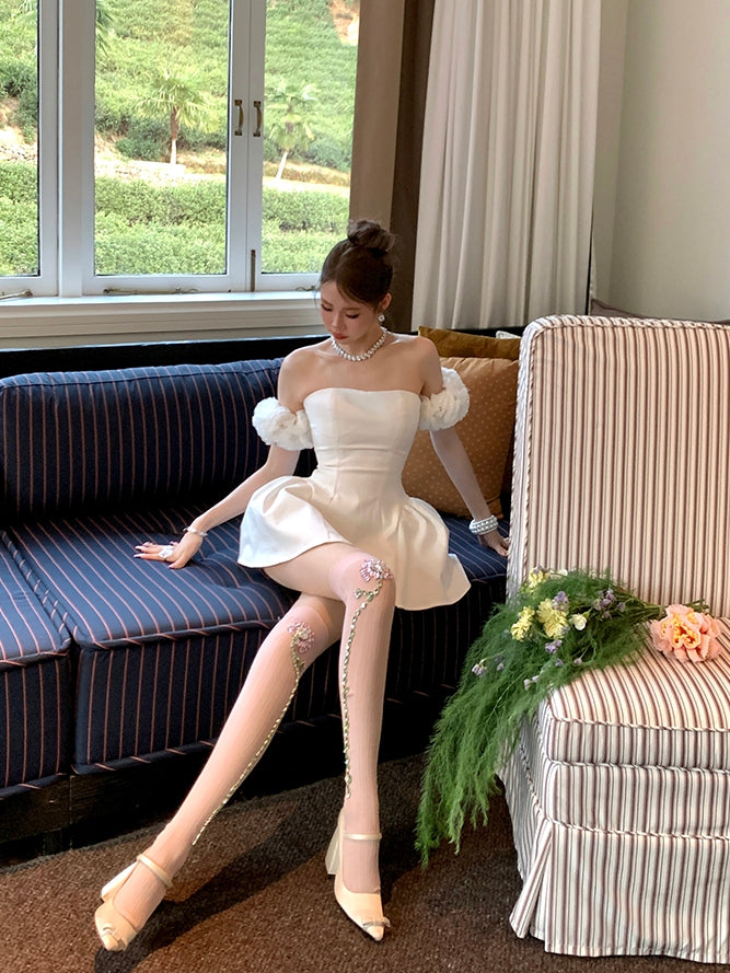 ピンク/ホワイトのラインストーン花柄オーバーニーストッキング