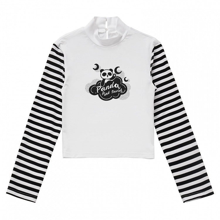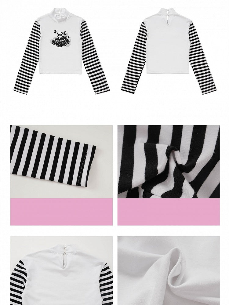 パンダプリントのブラックロングトップスと袖、ストライプ柄のホワイト