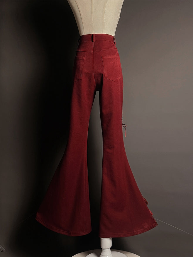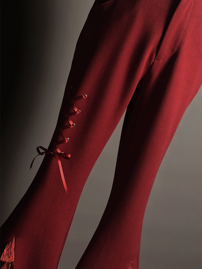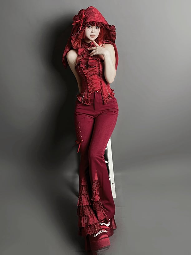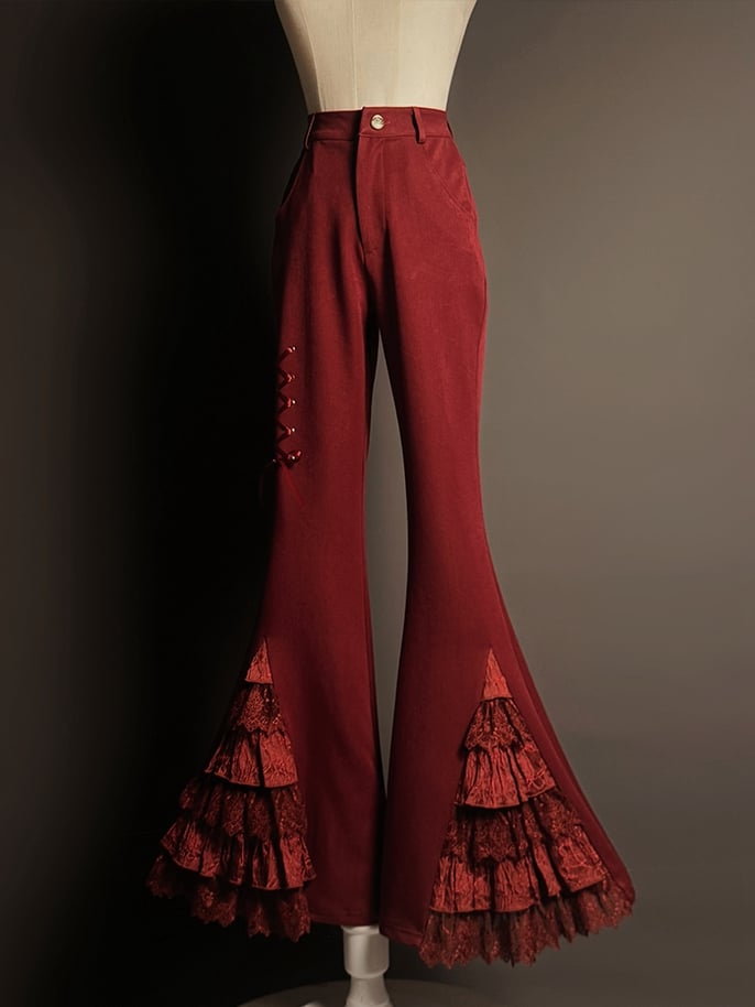 パンツの袖口は赤のレース、ティアードパッチ、フレア