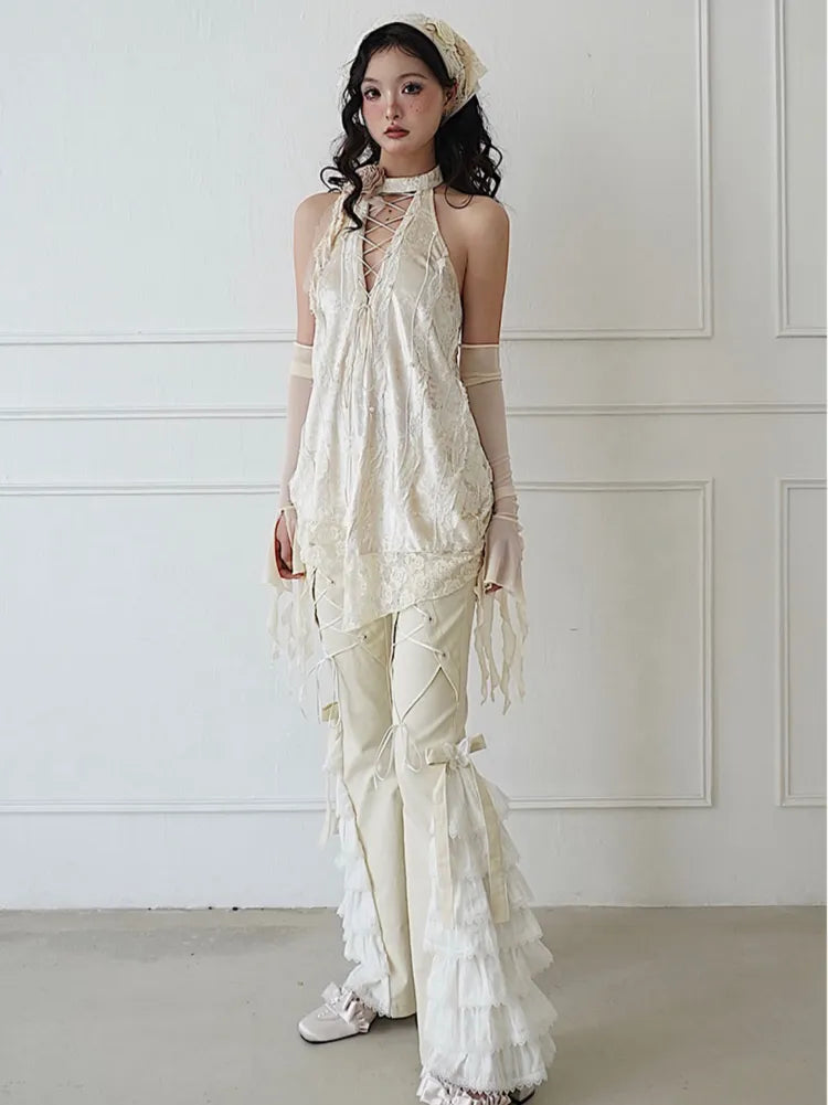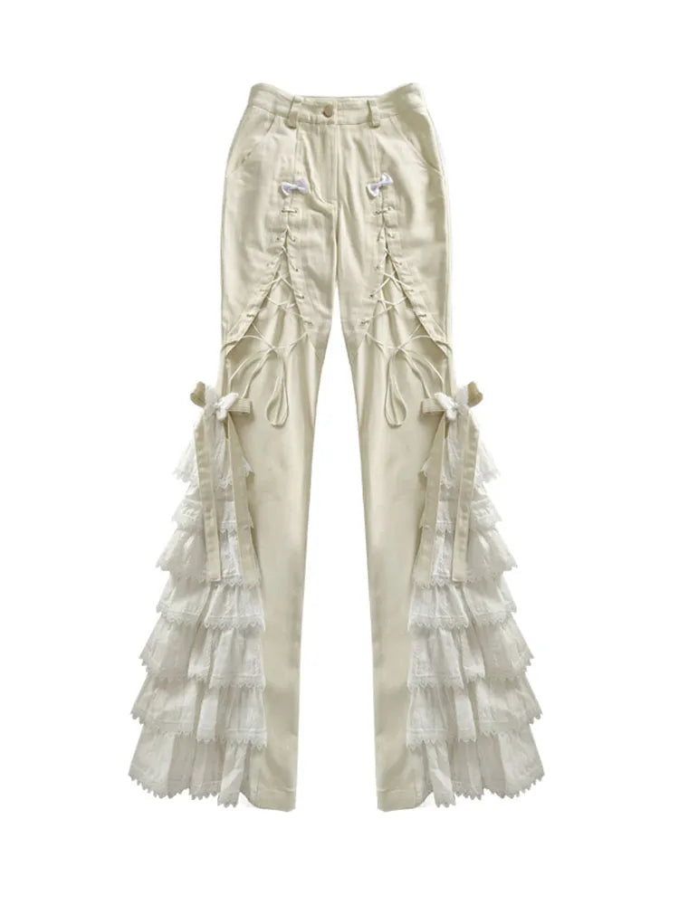 レースアップディテール、ベージュのティアードデザイン、リボンと蝶のフレアパンツ