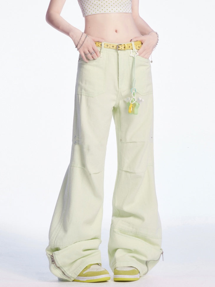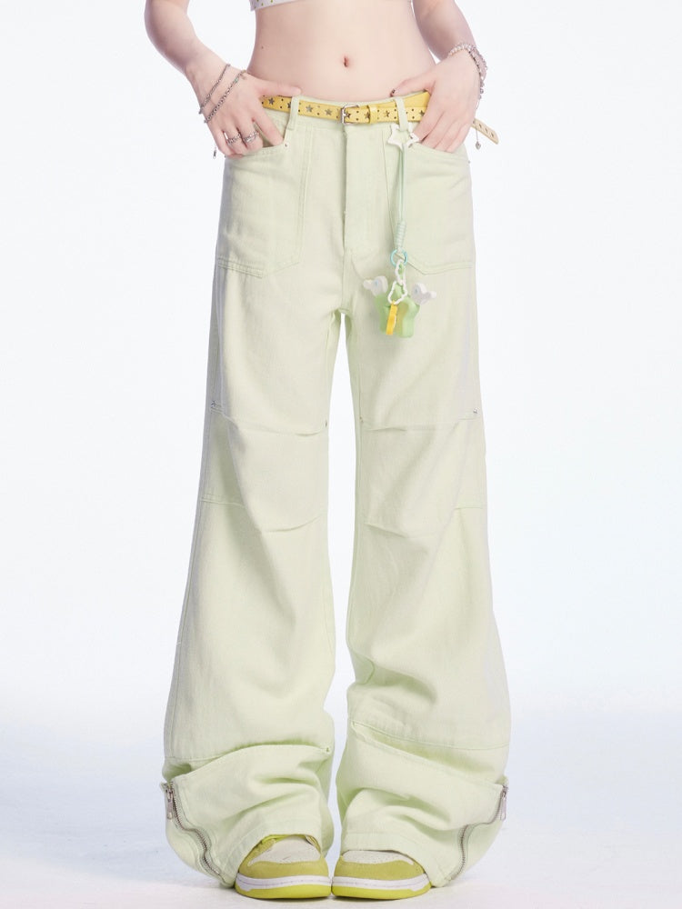 パンツ ライトグリーン ローウエスト ジップカフス ワイドレッグ カーゴ