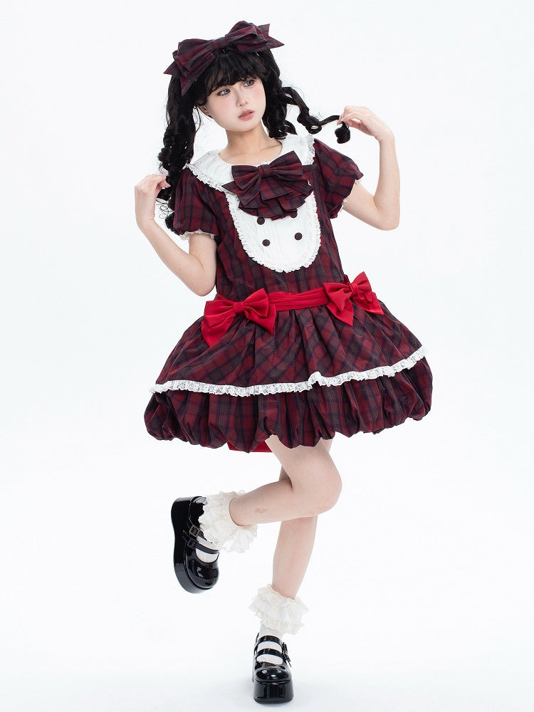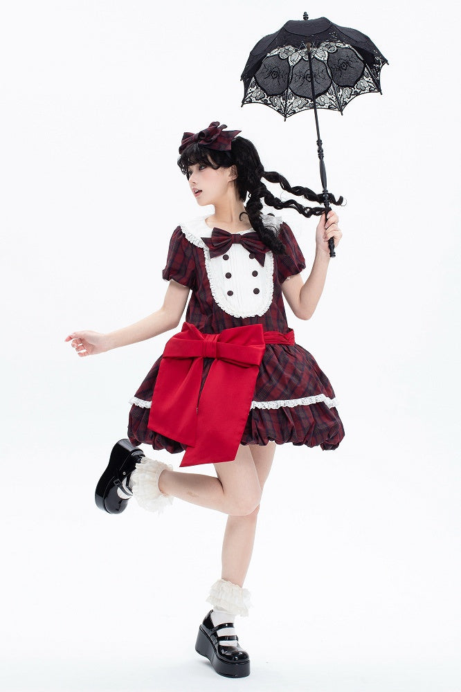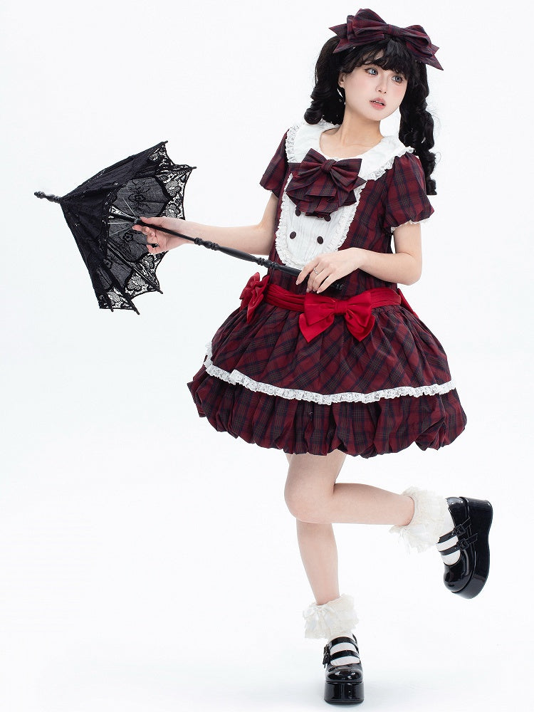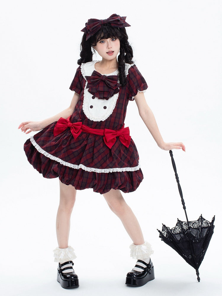 パターンパフスリーブレッドコットンバブルスカートチェック柄サマーロリータ