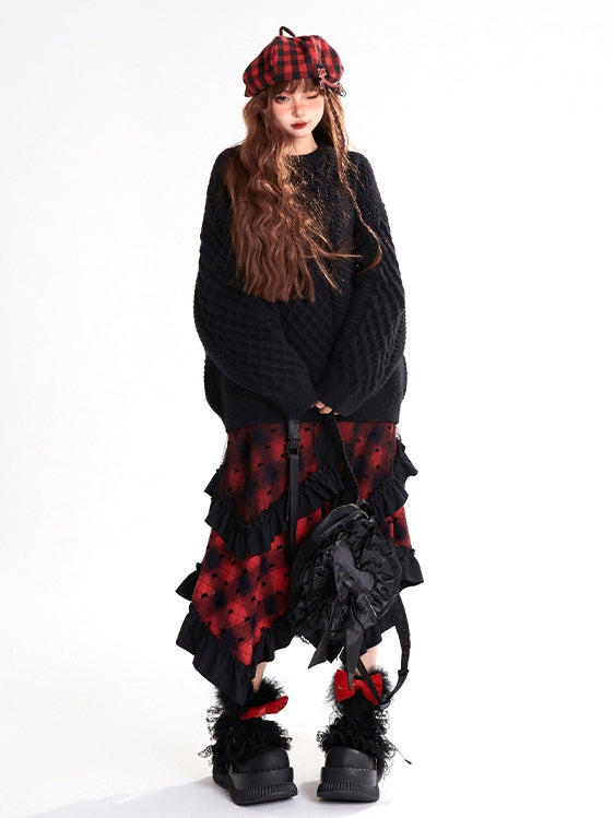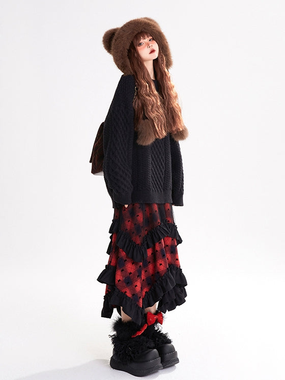 チェック柄の赤いハンカチ裾の蝶結びスカート