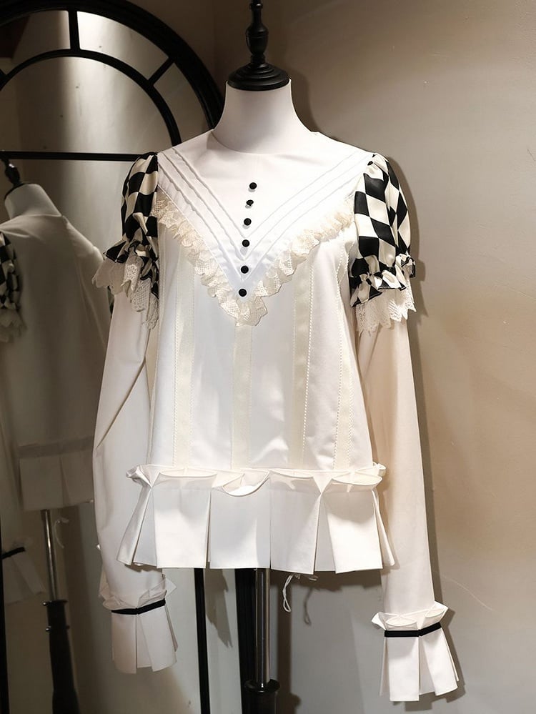 ベージュのパフヘムシャツの袖と取り外し可能なプリーツボックスチェック柄