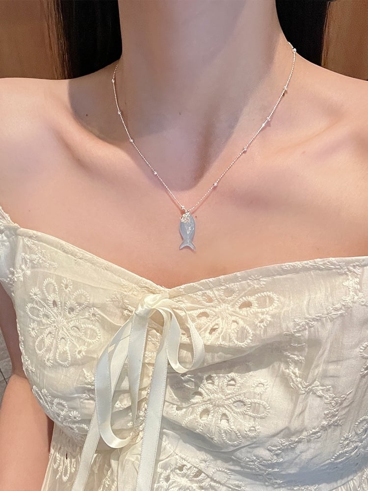 ブルー/ホワイト Y2K ビタースイートフィッシュ&ラインストーンハートペンダントネックレス