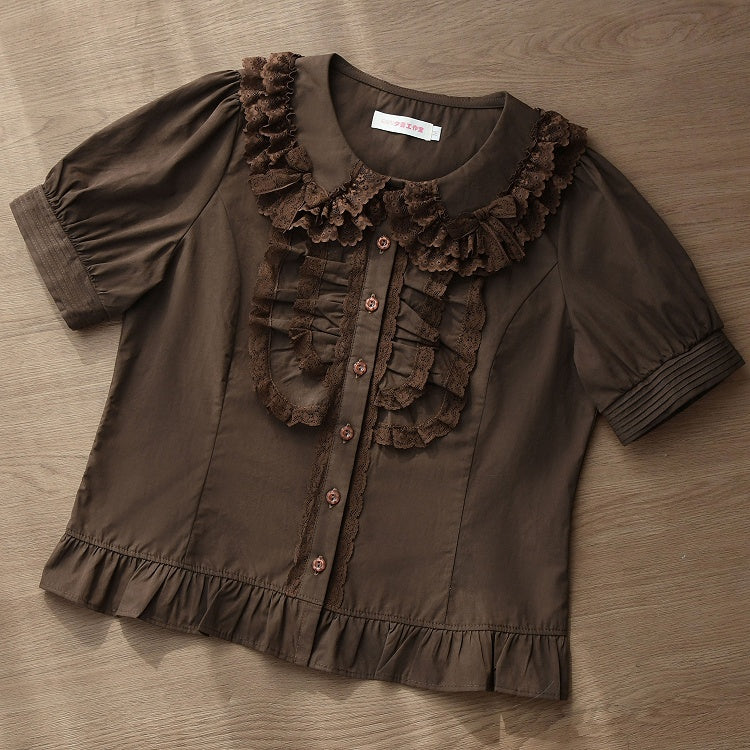 コーヒー色のピーターパンカラーショートパフスリーブコットンブラウス