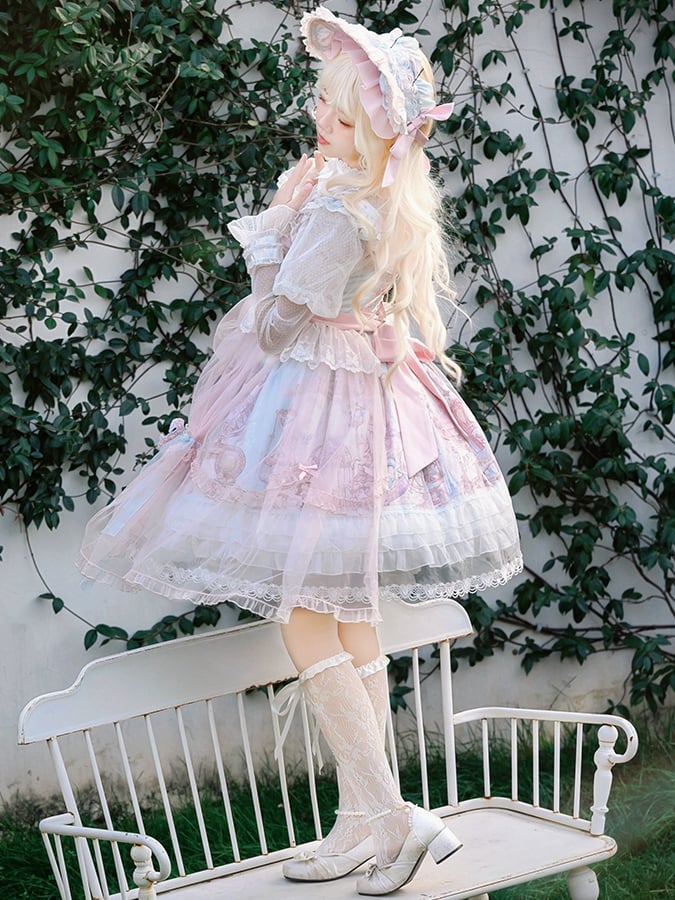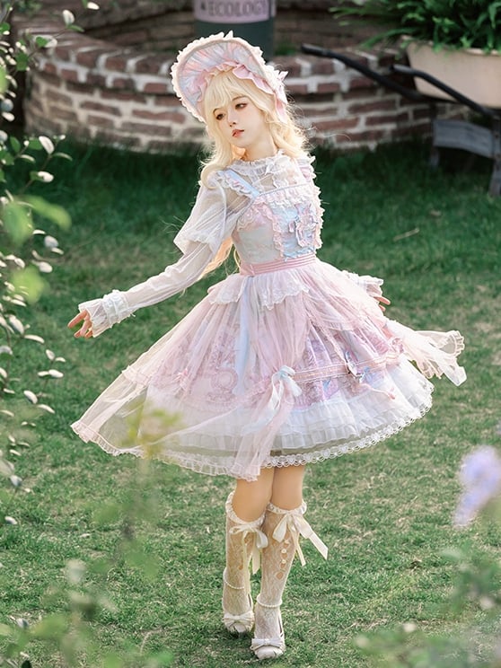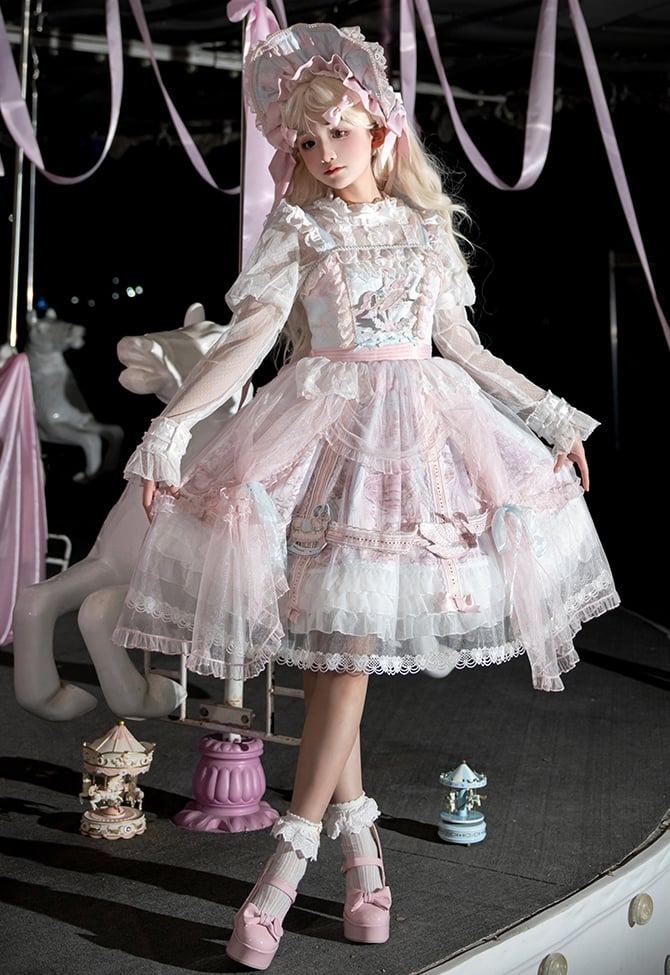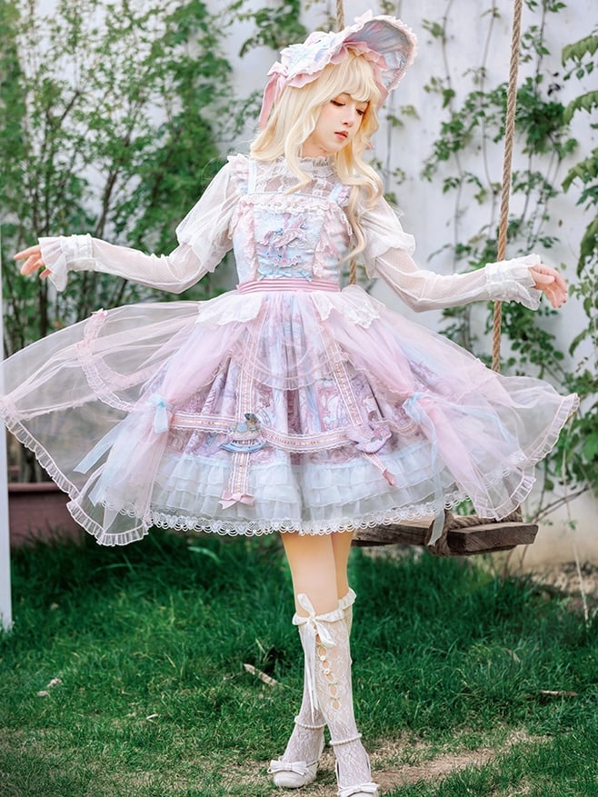 ピンクとブルーのカーテンチュールオーバーレイフライングホーススカートロリータジャンパースカート