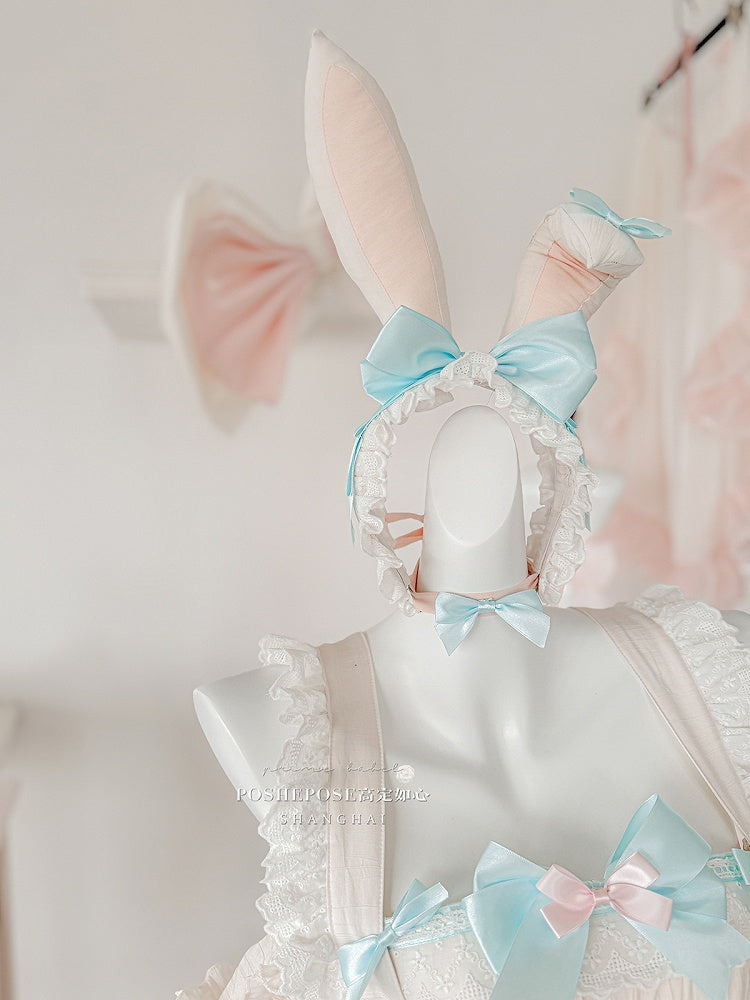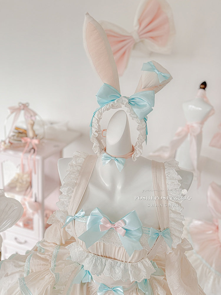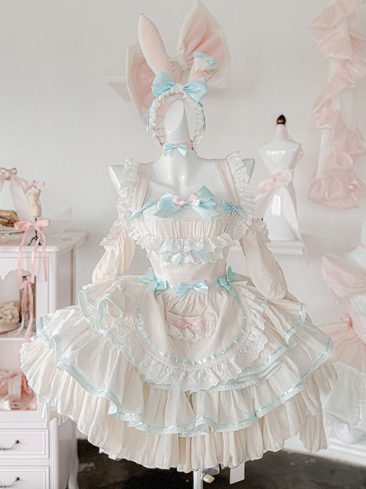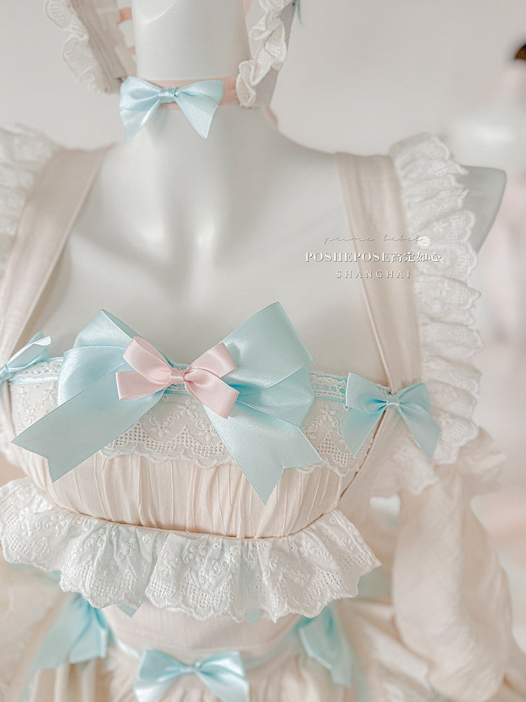 青と白のオールドスクールロリータファッションドレス 蝶結びディテール JSK セット