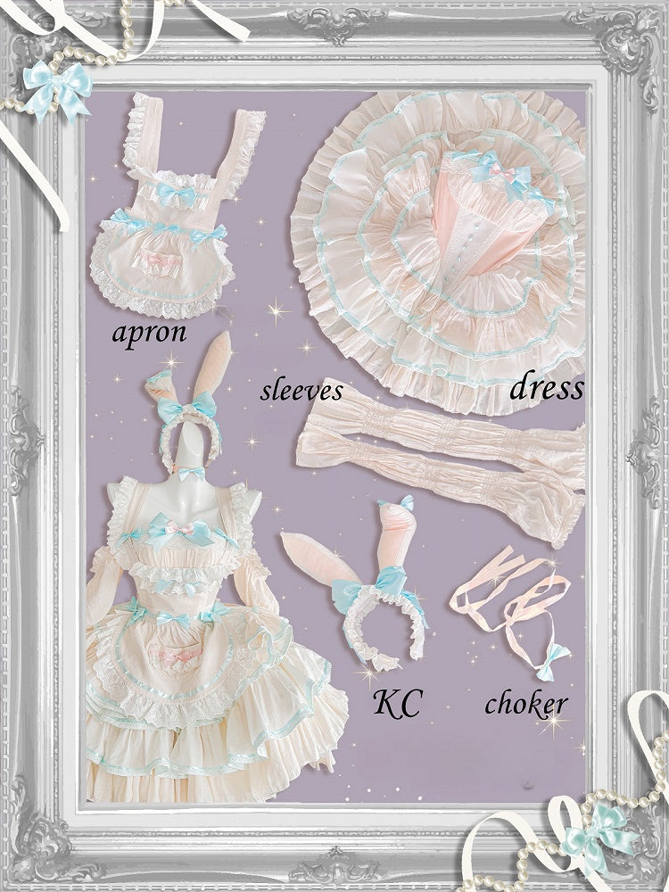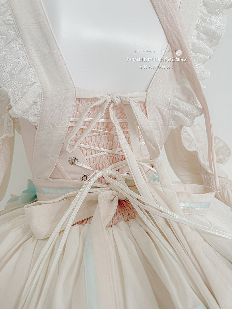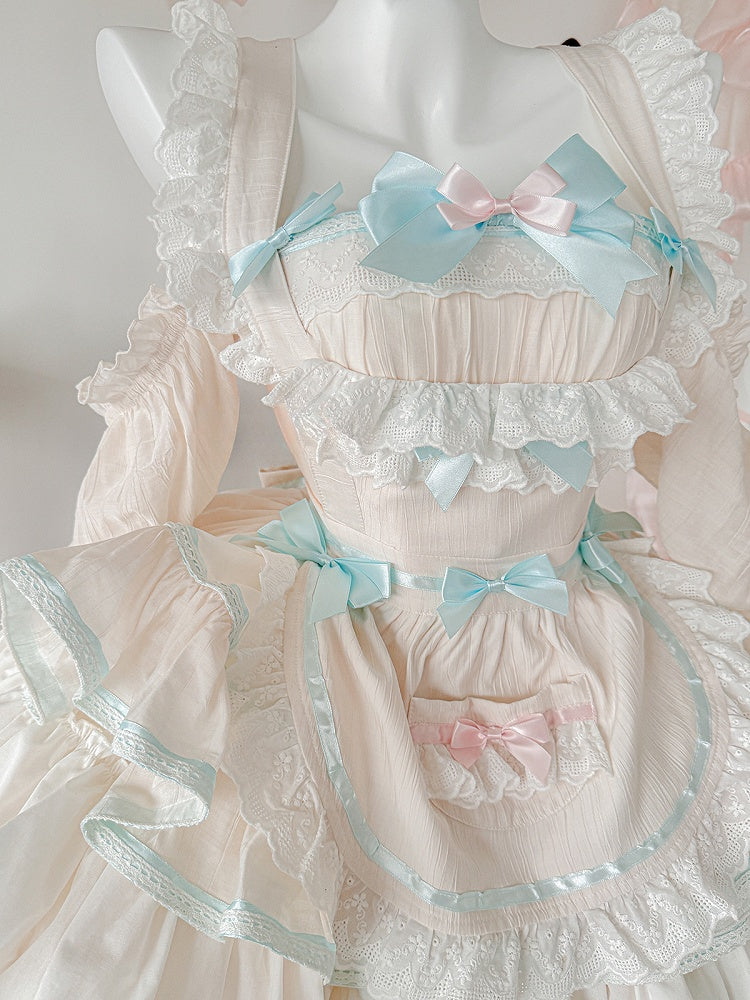 ピンクとミントグリーンのスイートメイドエプロン+バスクウエストティアードフリルヘムストラップレスパフィードレス