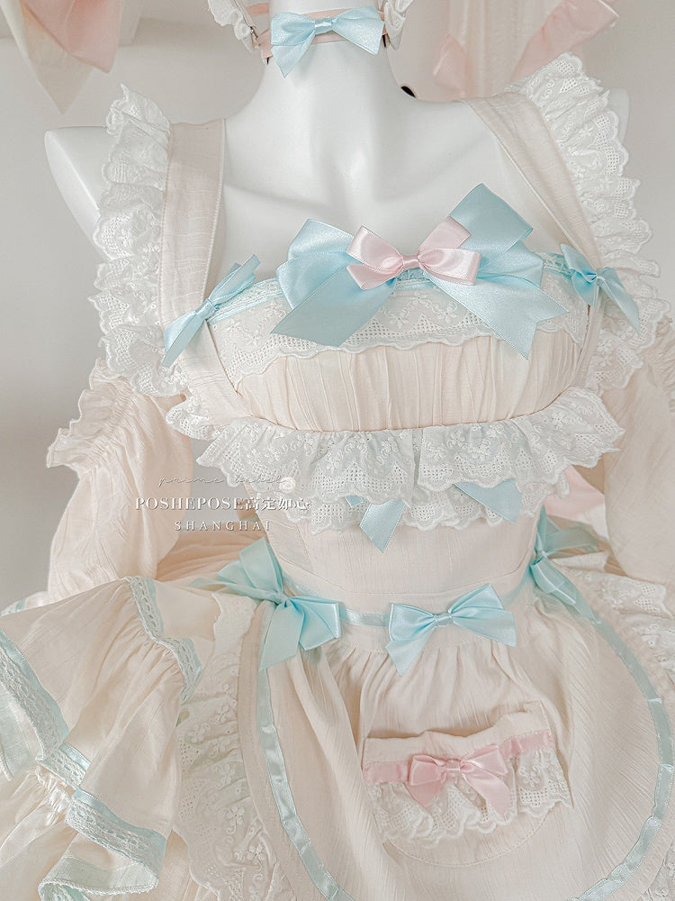 ピンクとミントグリーンのキュートなメイドエプロンに、バスクウエストのティアードフリルヘムのストラップレスパフィードレスを合わせれば、メイドサービスがワンランクアップ。清潔感と効率を保ちながら、キュートでスタイリッシュな装いに。どんな家事にもぴったりです。