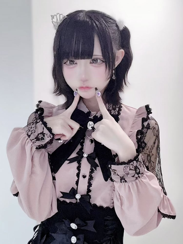 ピンクのジライケイビーズとラインストーンで飾られた蝶結びのディテール、フリルトリムブラウス