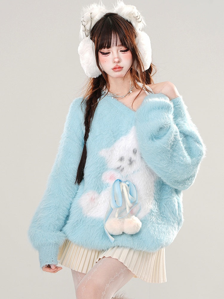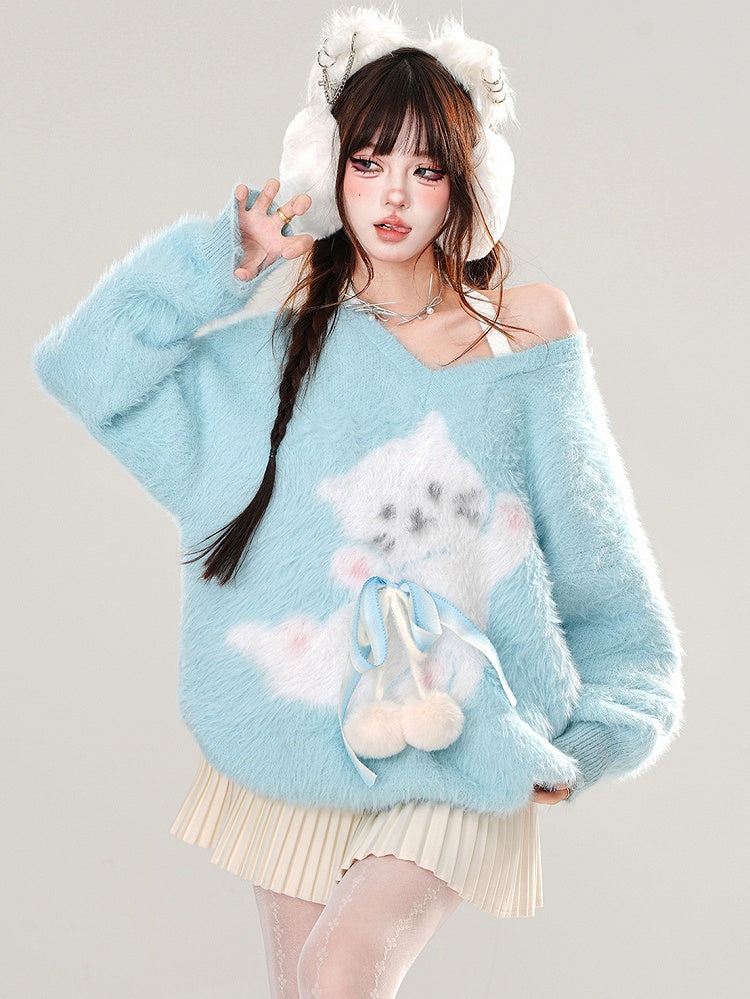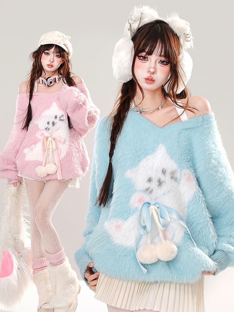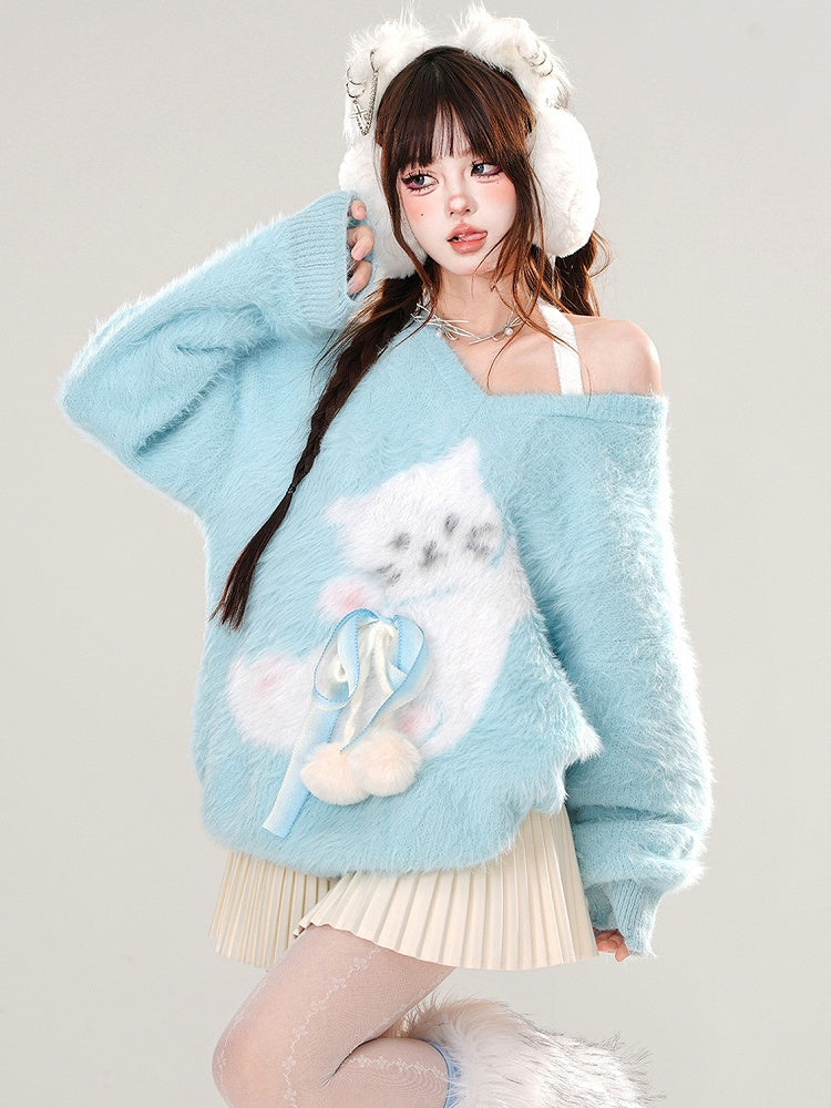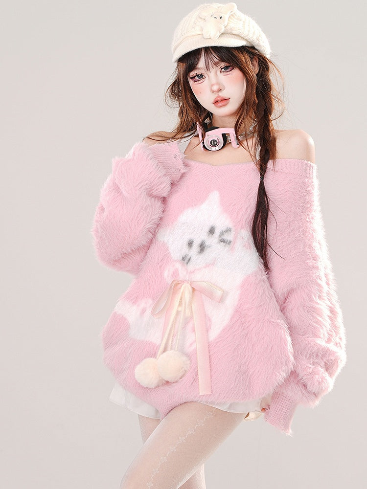 ピンク/ブルーのキュートなキティの蝶結びディテール、ホルターネックのソフトセーター