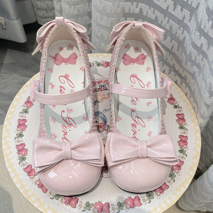 ピンクのリボンとラウンドトゥ、3.5cmブロックヒールのロリータメリージェーン