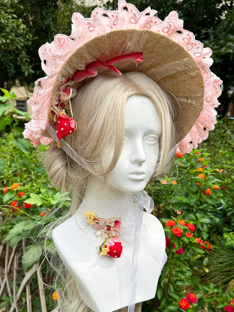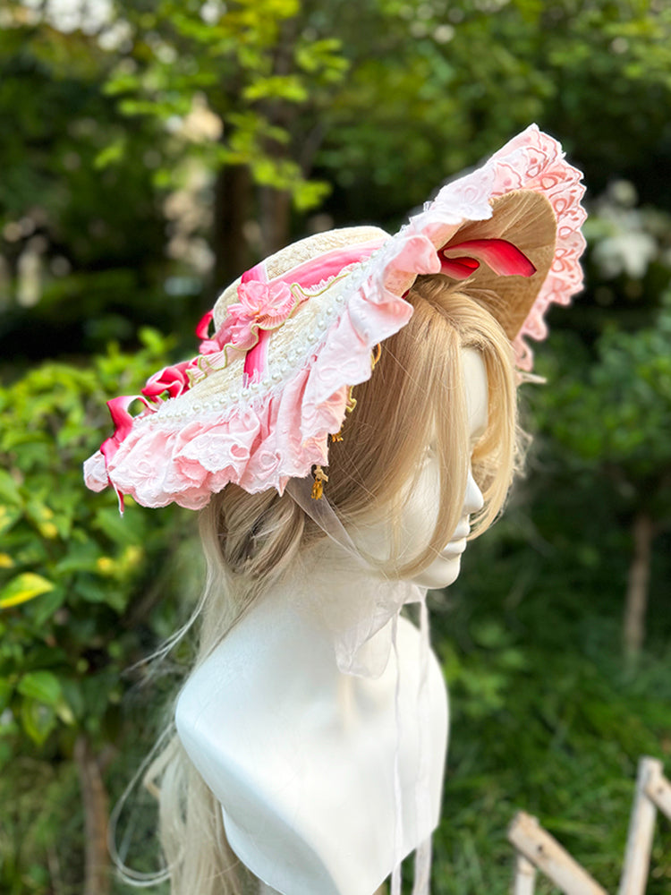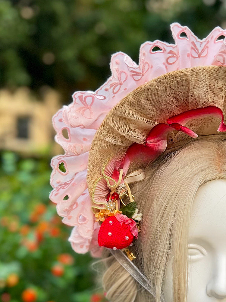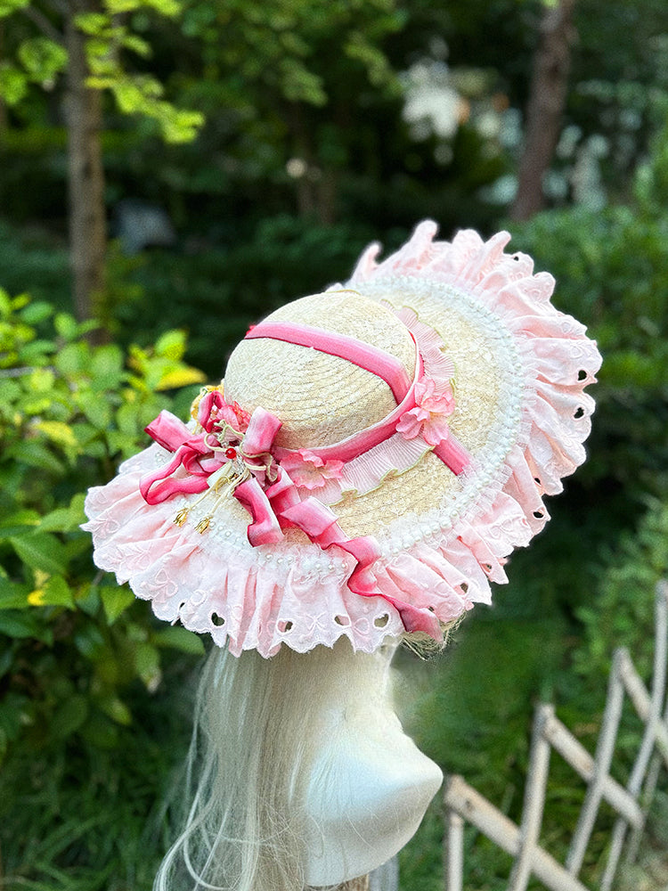 ピンクの蝶結びフリルトリムとビーズのスイートロリータ麦わら帽子、イチゴチャーム付き