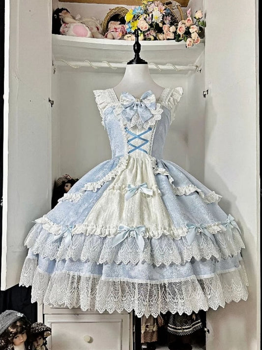 青と白のオールドスクールロリータファッションドレス 蝶結びディテール JSK セット
