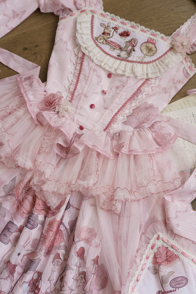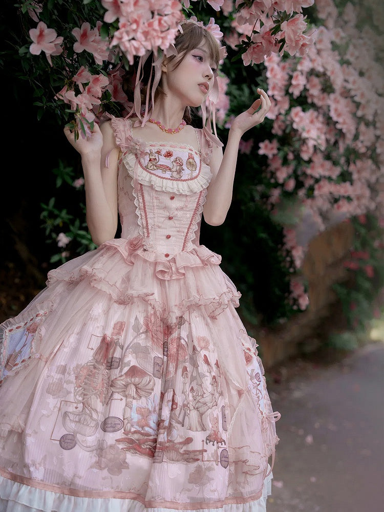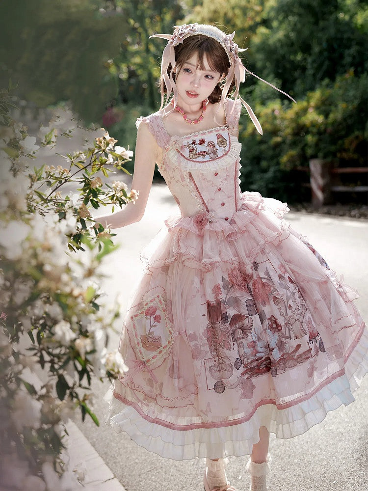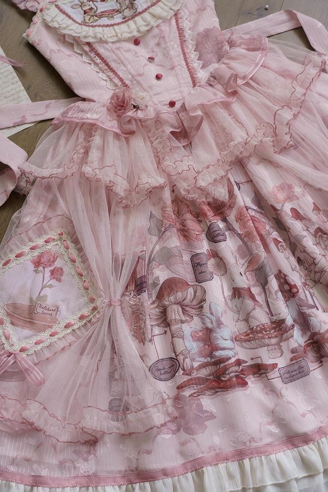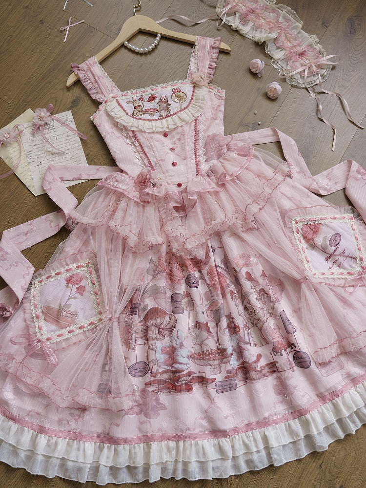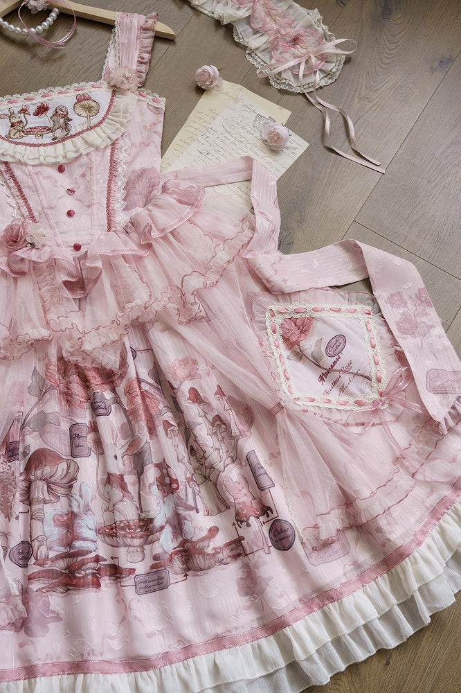 ピンクプリンセスバスクウエストバニーとマッシュルームプリントロリータジャンパースカート