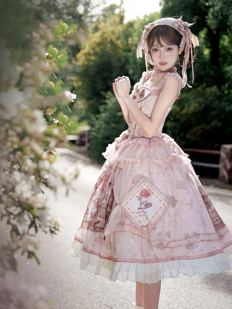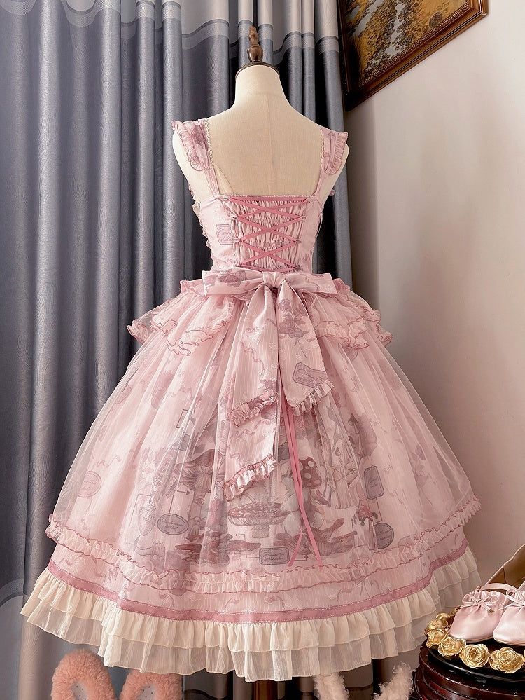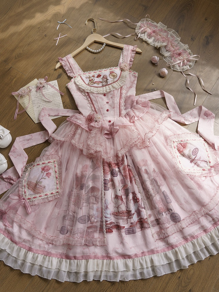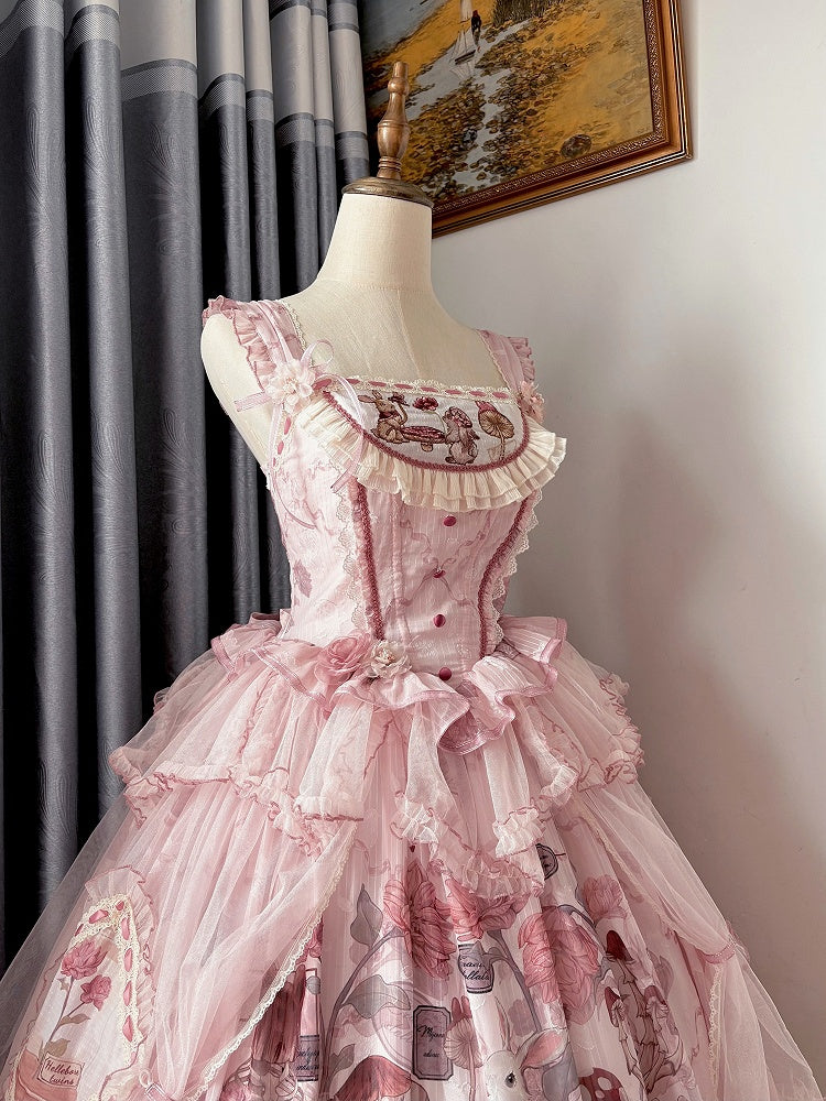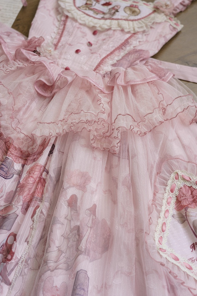 ピンクプリンセスバスクウエストバニーとマッシュルームプリントロリータジャンパースカート