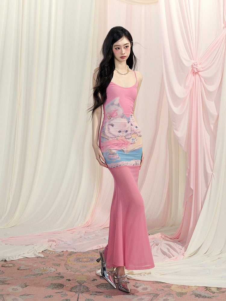 ピンクのキュートな猫柄ボディコンスリップドレス マーメイドスカート
