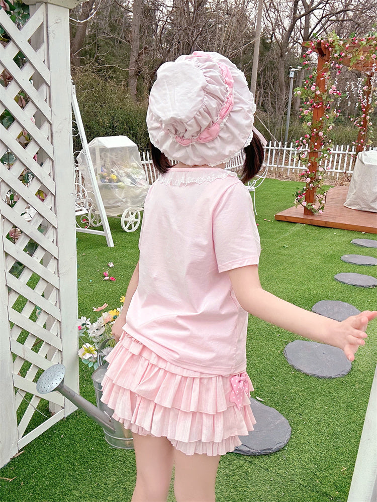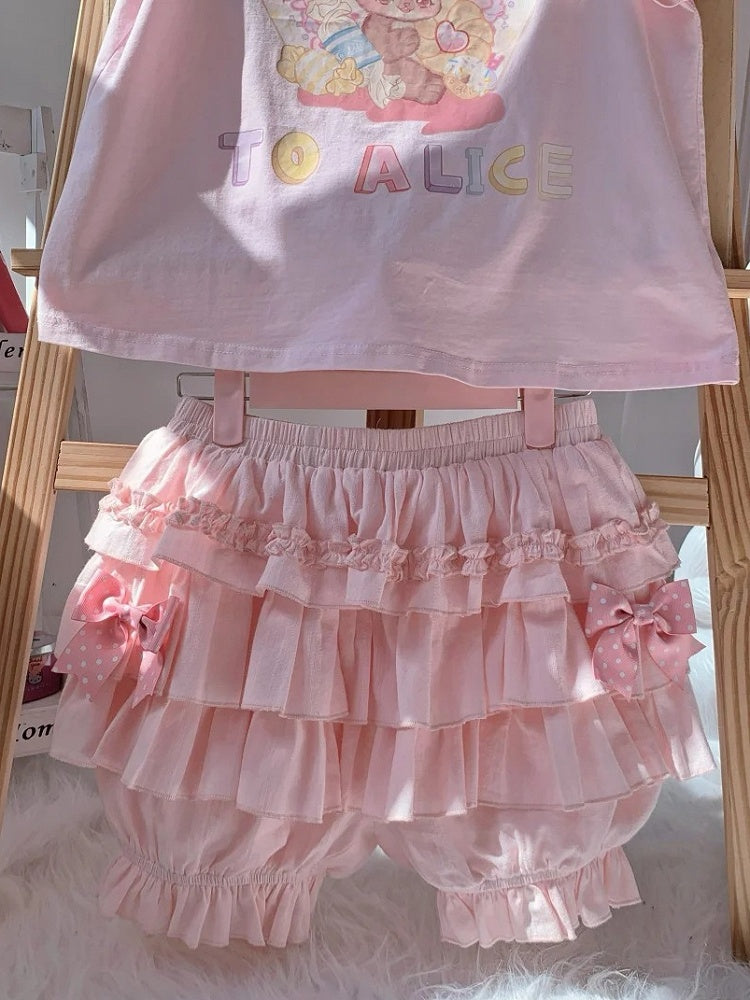 ピンクの伸縮性ウエスト、蝶結び、サイドアクセント、ティアードフリル、ブルマー