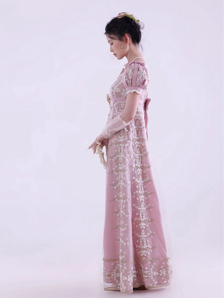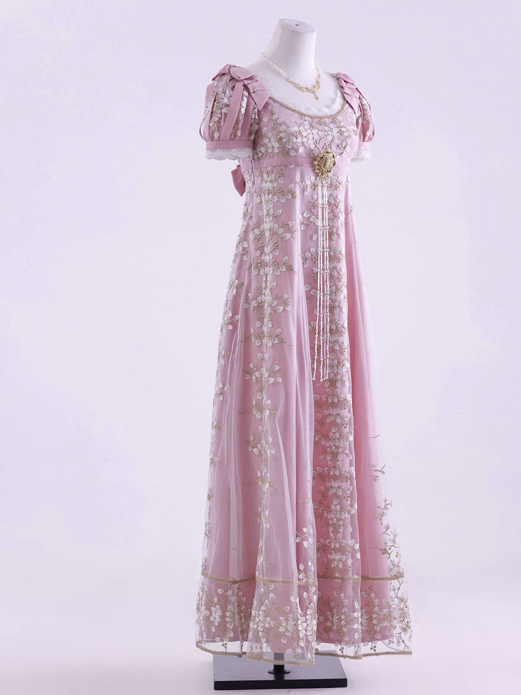 ピンクのエンパイアウエストがエレガントなリージェンシーロリータマキシドレスで、エレガントで優雅な雰囲気を演出しましょう。足首丈バージョンは、美しいエンパイアウエストと高貴なデザインが特徴で、どんなシーンにもぴったりです。この魅力的なドレスで、お部屋で一番素敵な女性になりましょう。