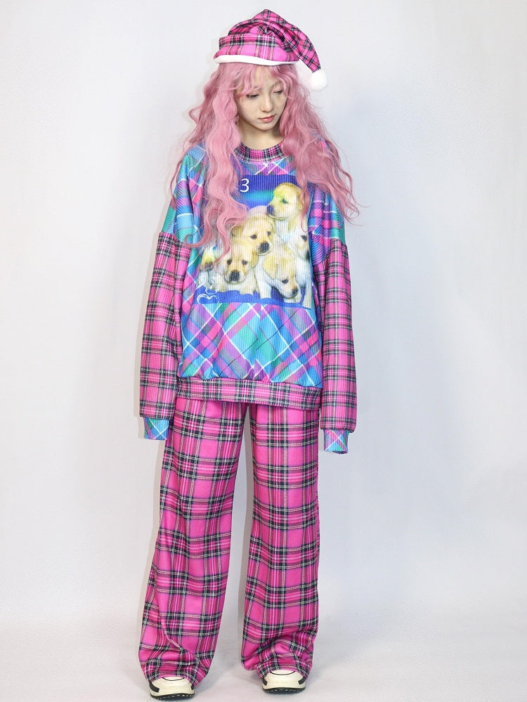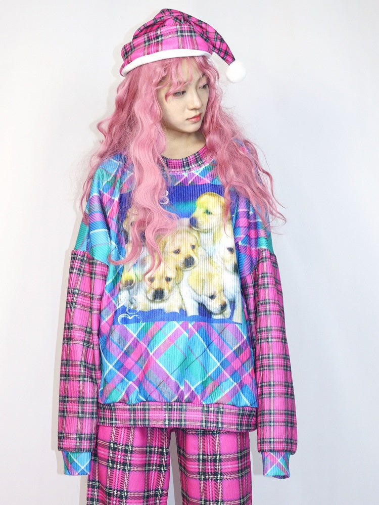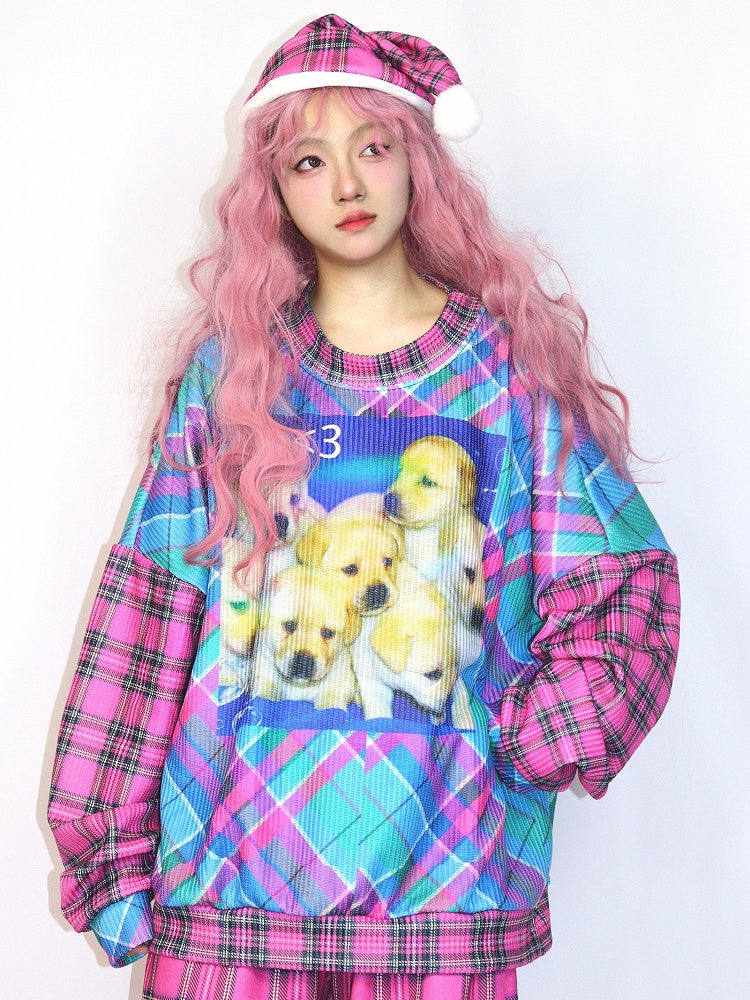 ピンクとブルーのギャルファッション、チェック柄と子犬のプリントが入ったオーバーサイズスウェットシャツ