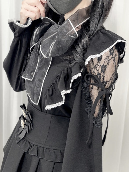 ● 大きなリボン / コントラストのレースパッチ / カットアウトショルダー / フロントボタンプラケット / レーストリム / セルフタイストラップ