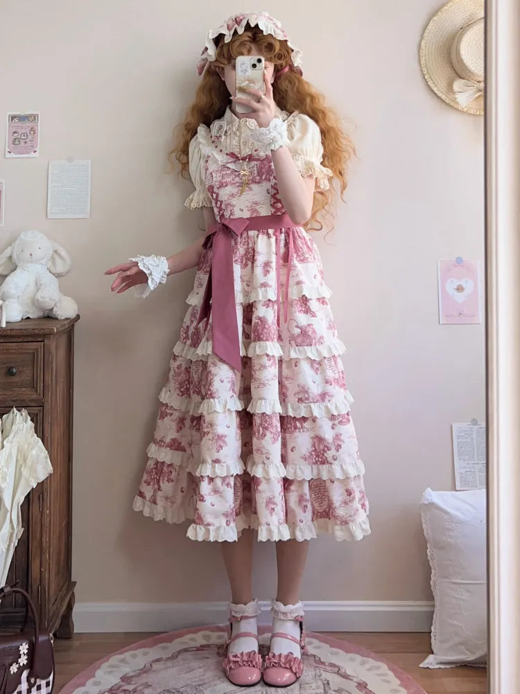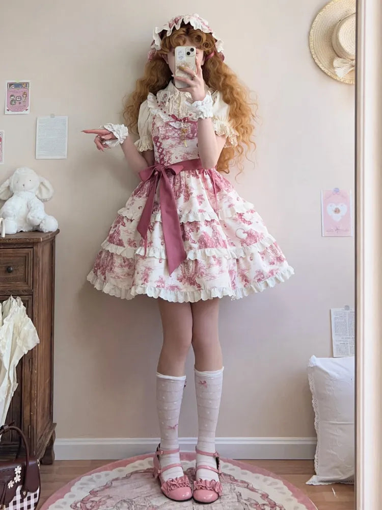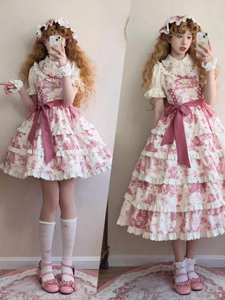 ピンクと白のオールドスクールロリータファッションドレス、蝶結びディテール、ロリータJSKセット