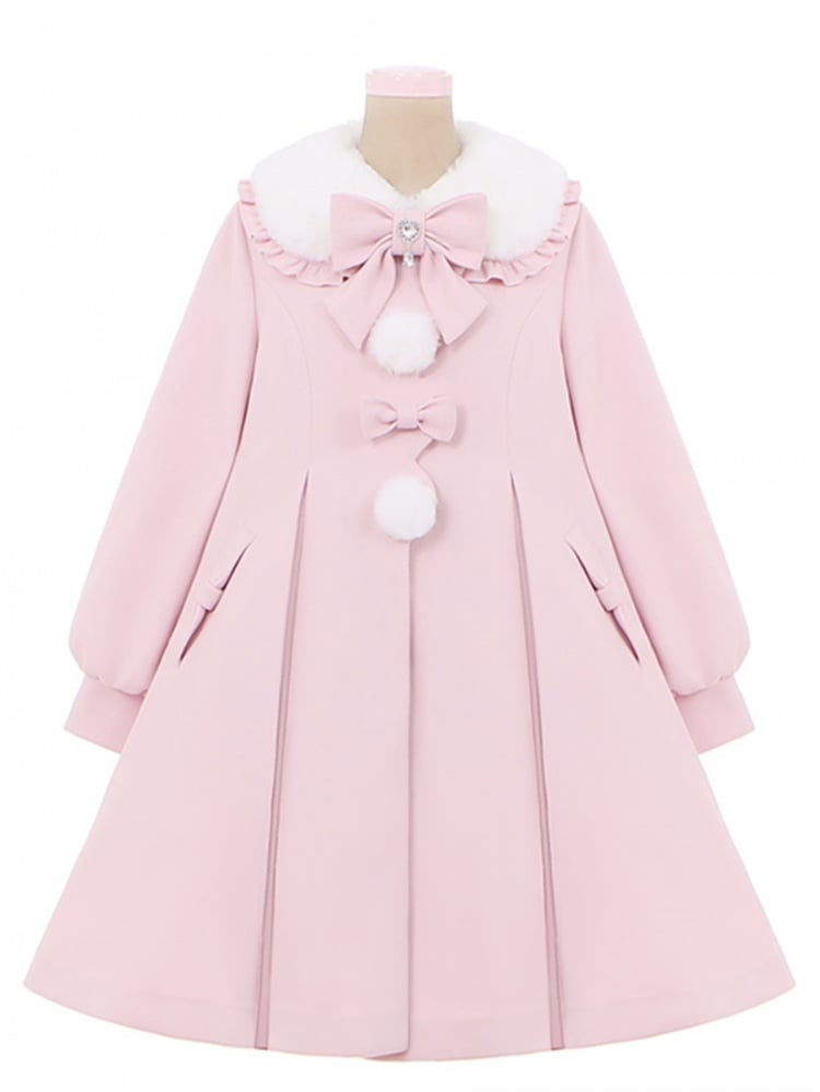 ピンクのプラッシュカラーのリボンアクセントロングコート