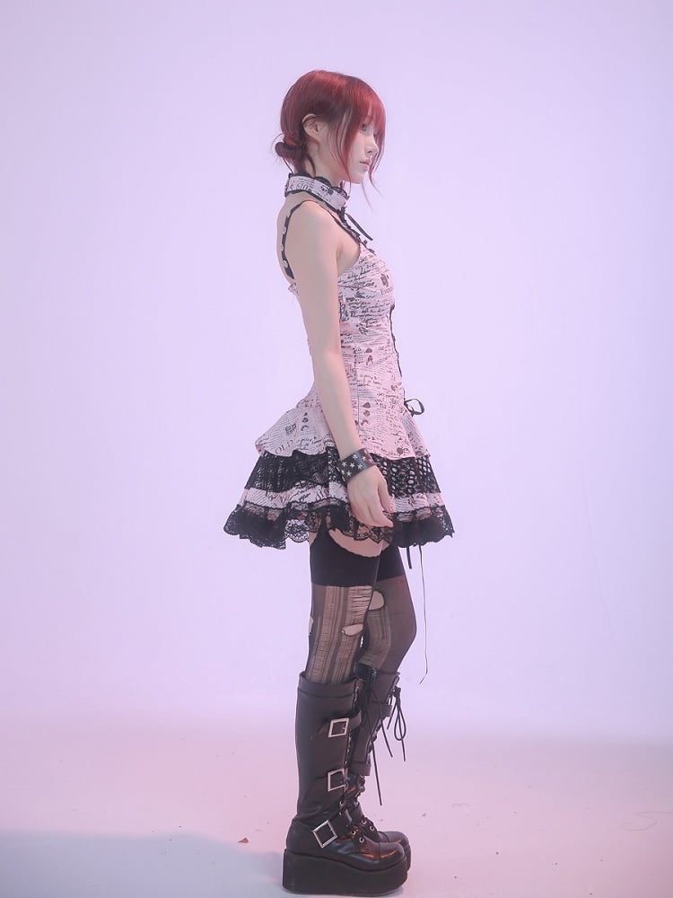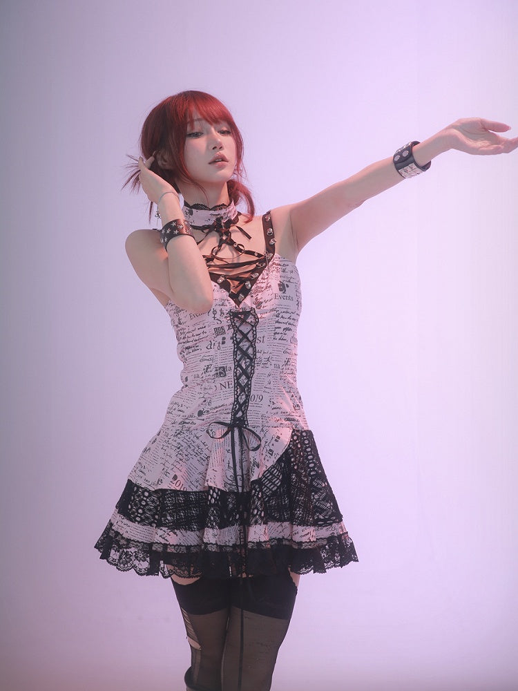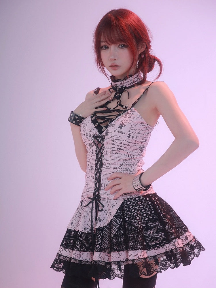 ピンクプリントのノースリーブレーストリムパンクロックドレス