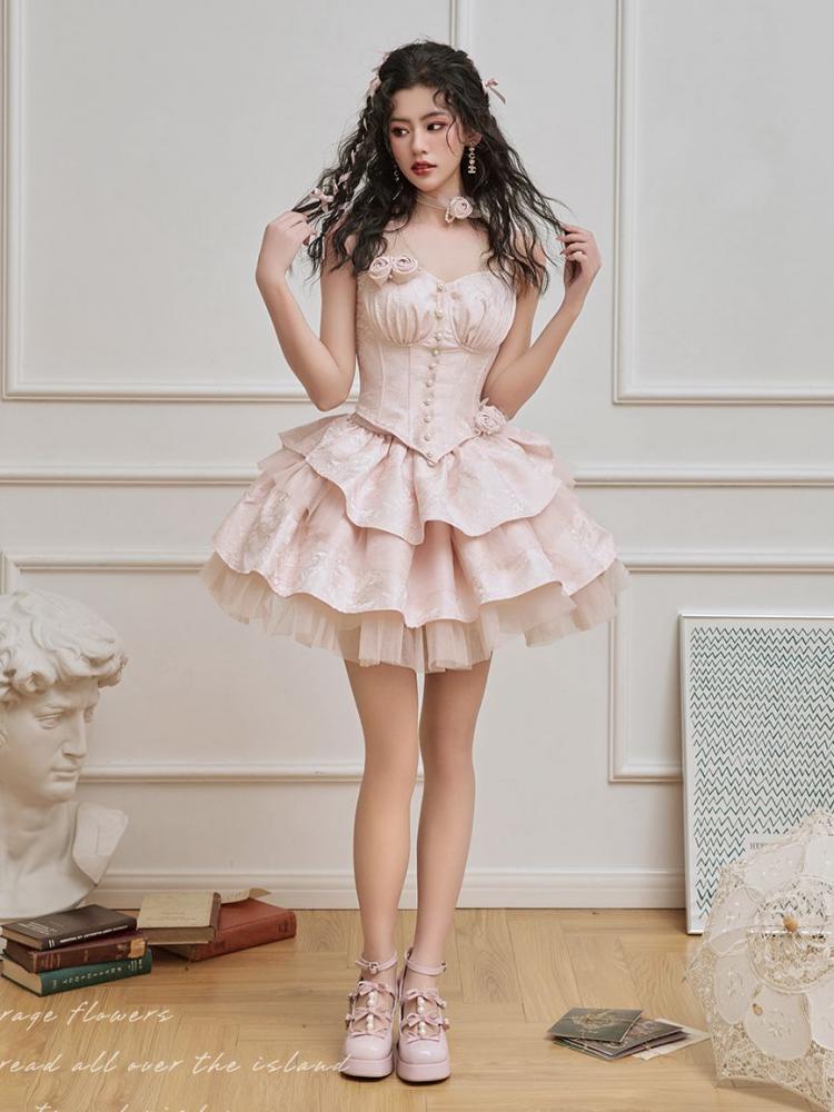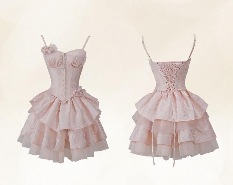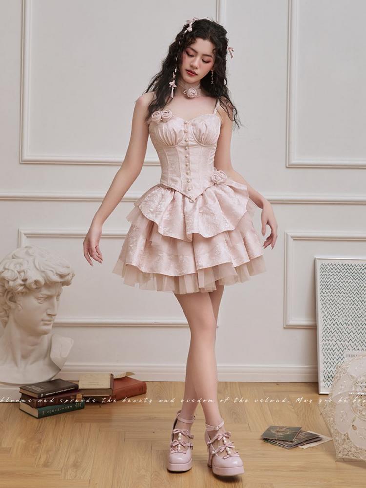 ピンクと白のオールドスクールロリータファッションドレス、蝶結びディテール、ロリータJSKセット