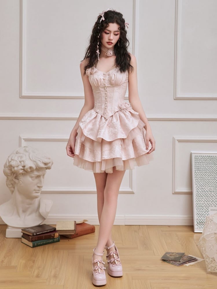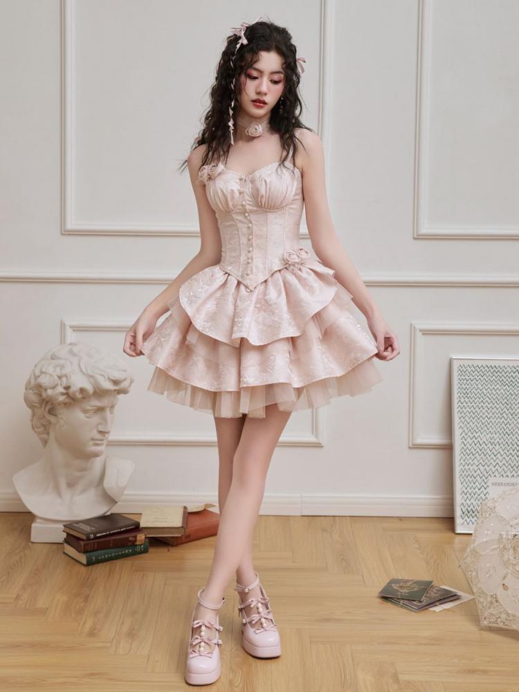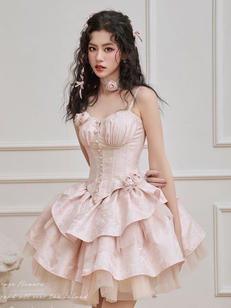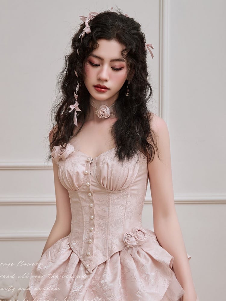 ピンクのロゼットブローチ付きボーン入りコルセットトップ