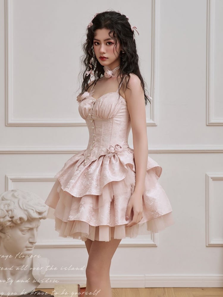 ピンクのロゼットブローチがアクセントになったボーン入りコルセットトップで、ワンランク上のスタイルを演出しましょう。繊細なピンクのロゼットとブローチが、甘さと魅力を添えます。このコルセットトップは、ファッショナブルなだけでなく、ボーン入りのデザインがボディラインを美しく引き立てます。どんな装いにも映える素敵なアクセントになります。