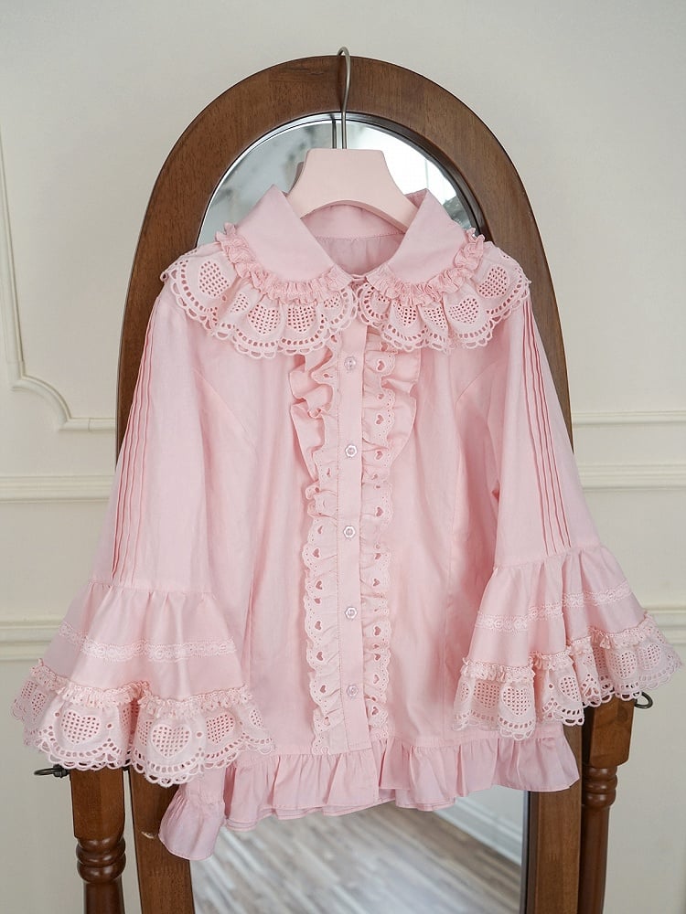 ピンクのラウンドフラットカラーベルスリーブコットンブラウス