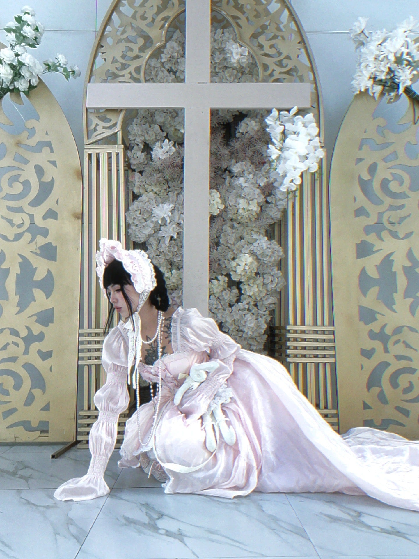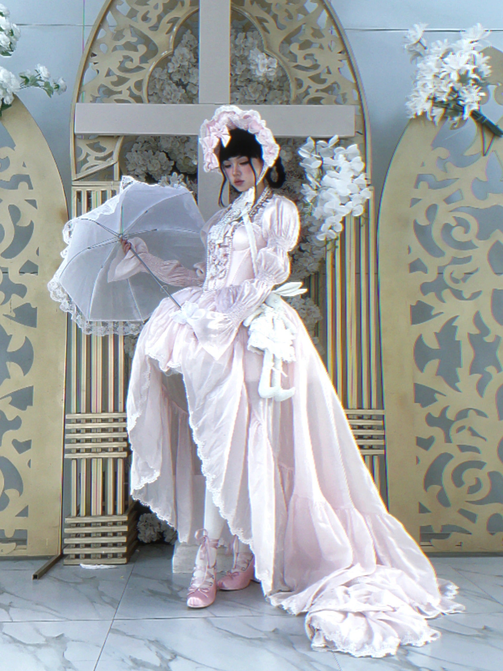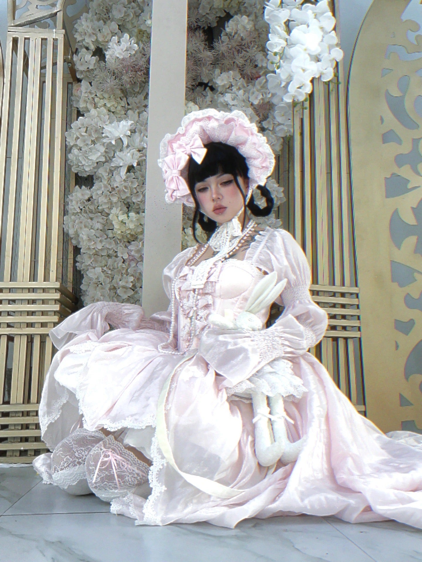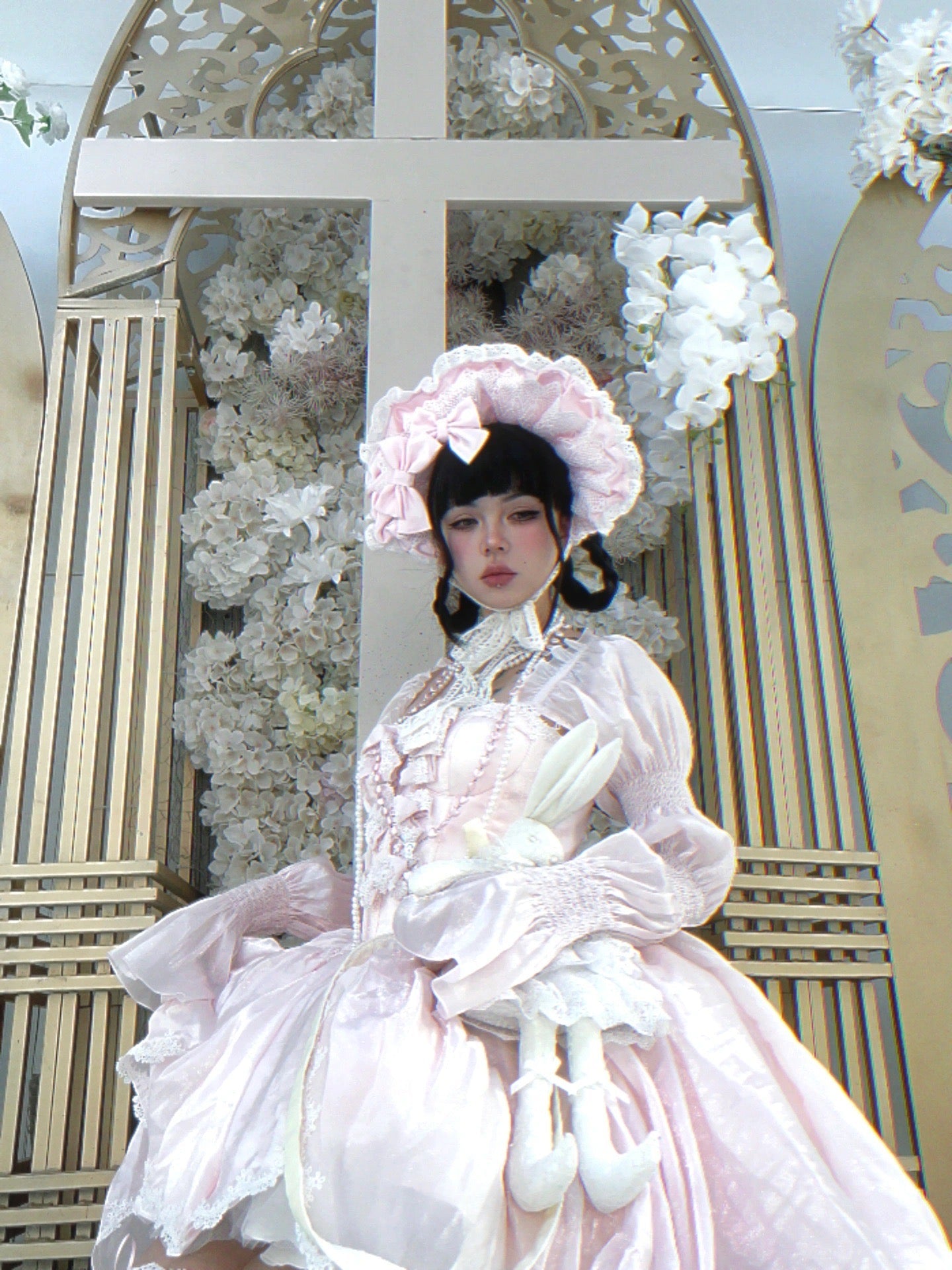 ピンクと白のオールドスクールロリータファッションドレス、蝶結びディテール、ロリータJSKセット