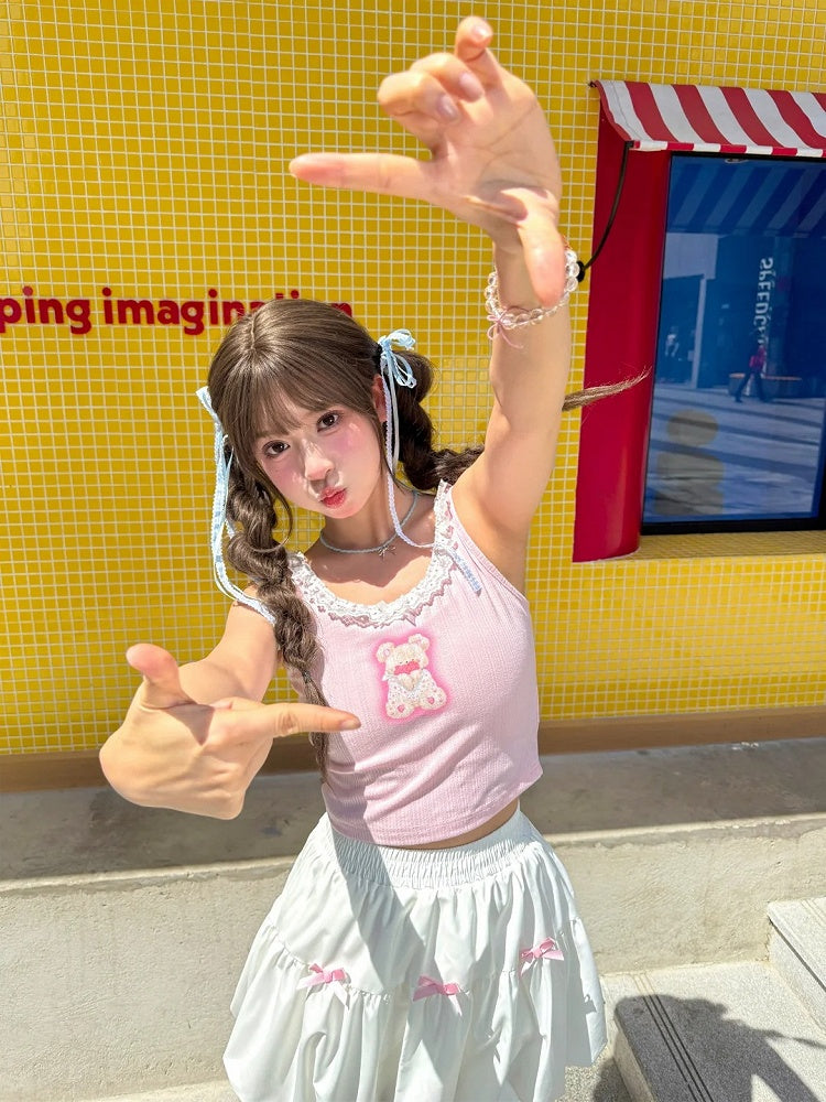 Pink Teddy Bear Print Lace Trim Neckline Sweet Tank Top