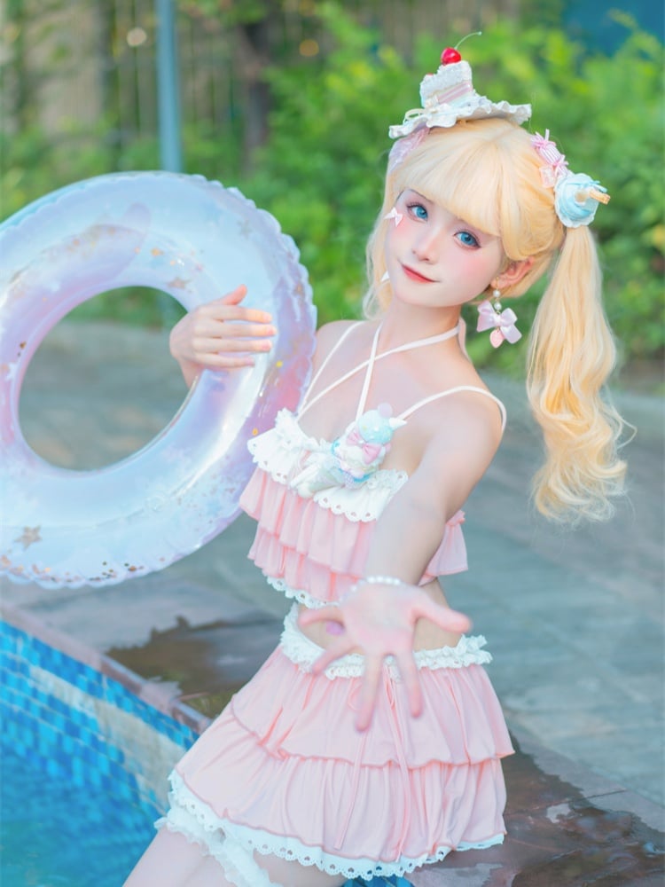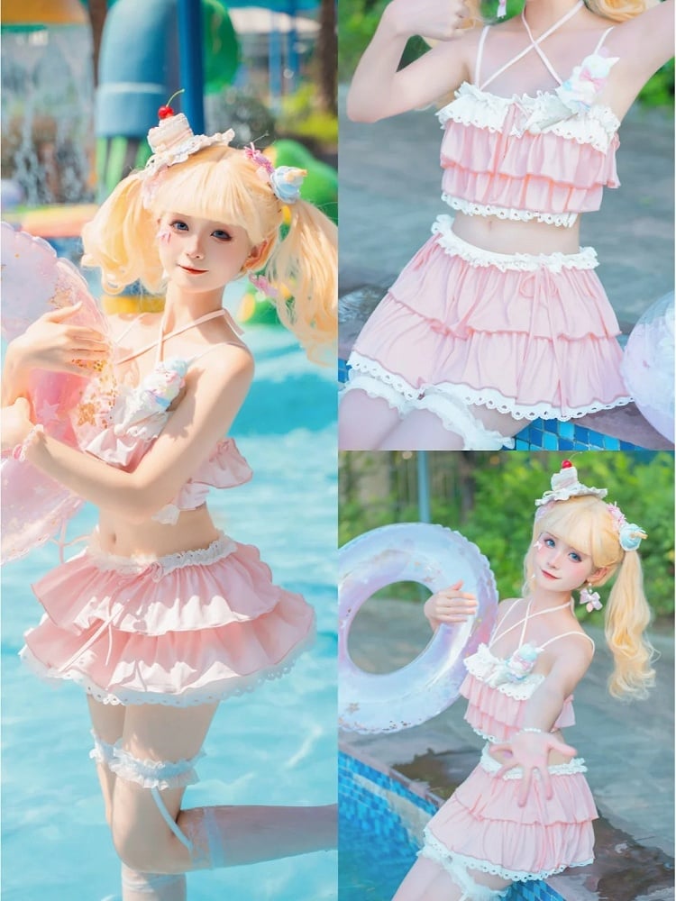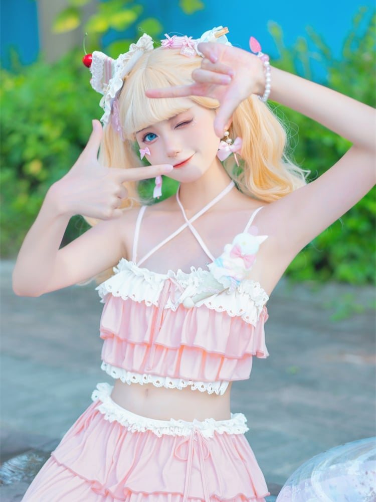ピンクのティアードフリル、蝶結びディテール、レーストリムの水着