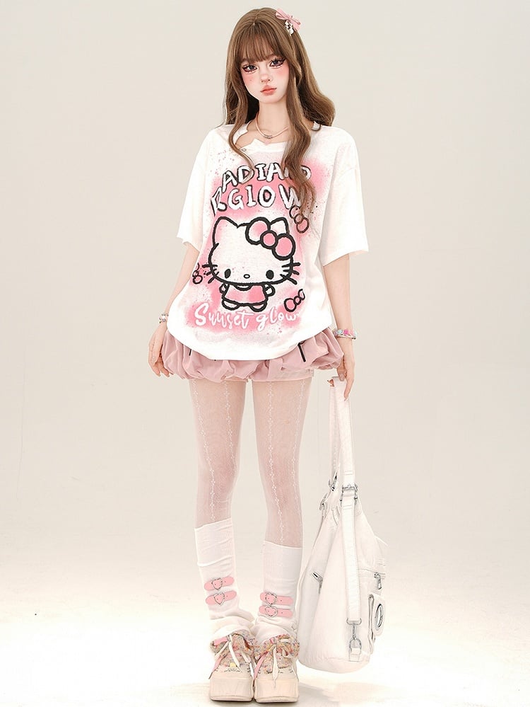 ピンク/ホワイト キティプリント ルーズTシャツ