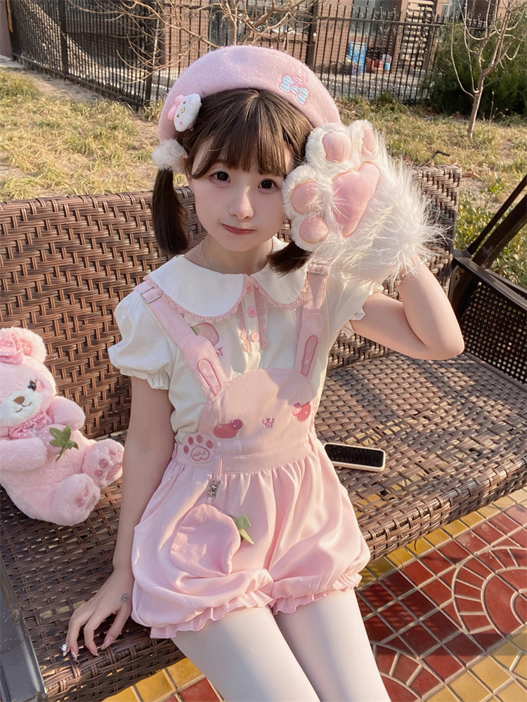 コントラストピンクのトリム、ストロベリー柄、ホワイトのピーターパンカラー、パフスリーブのブラウス