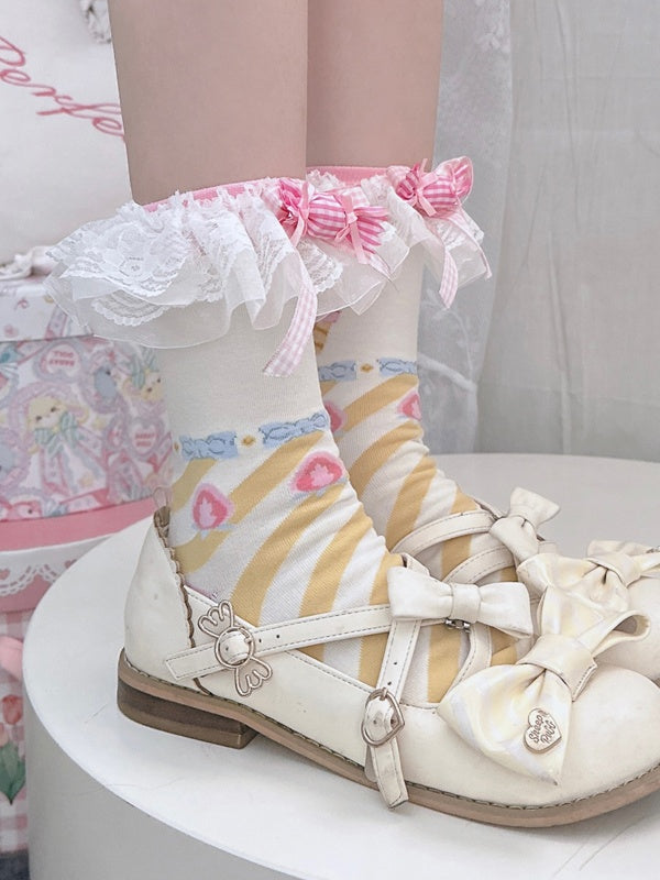 ピンク&イエローのスイートロリータリボンストライプ柄カーフソックス