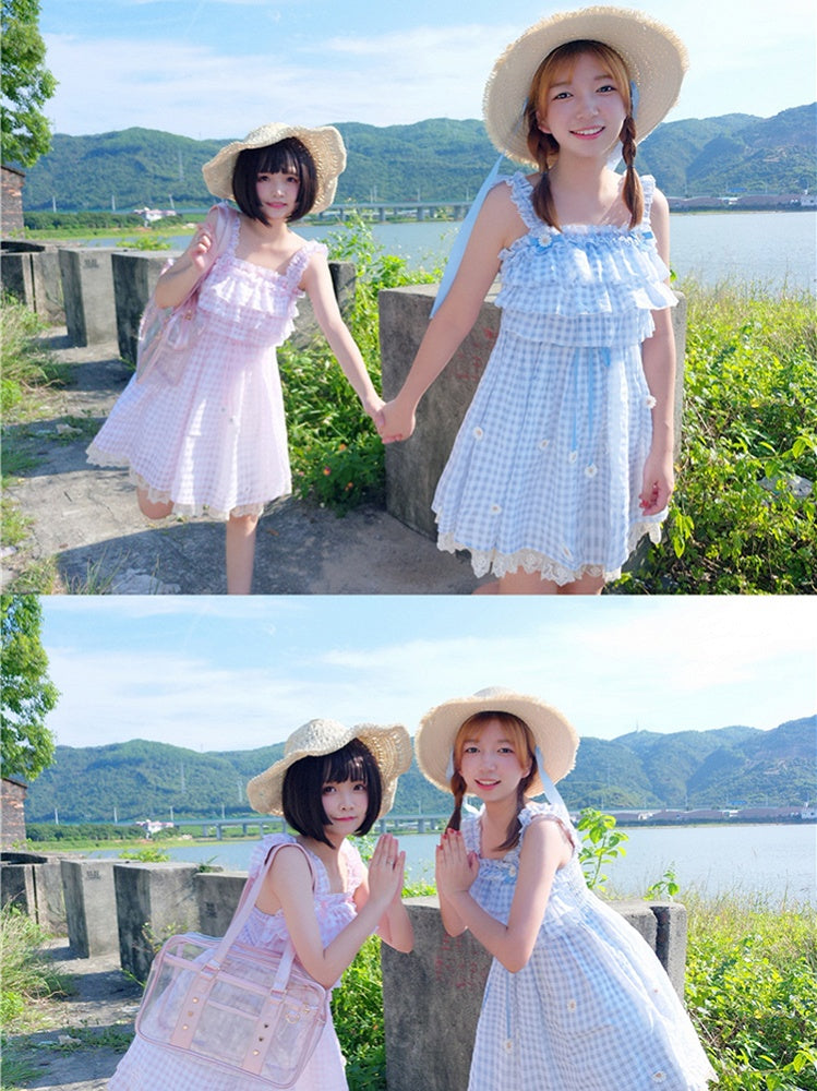 青と白のオールドスクールロリータファッションドレス 蝶結びディテール JSK セット
