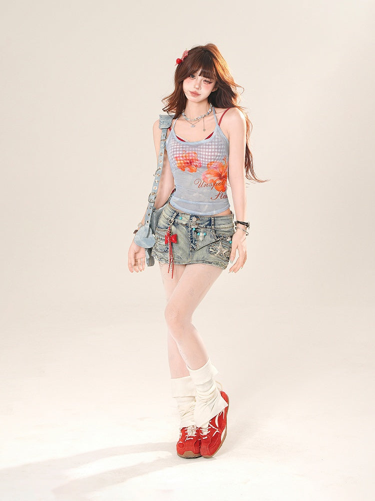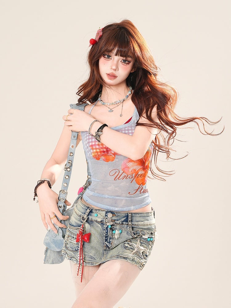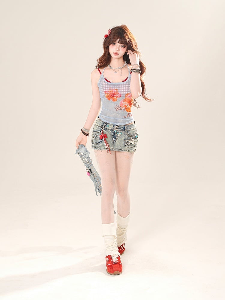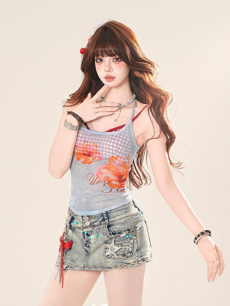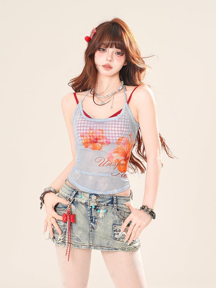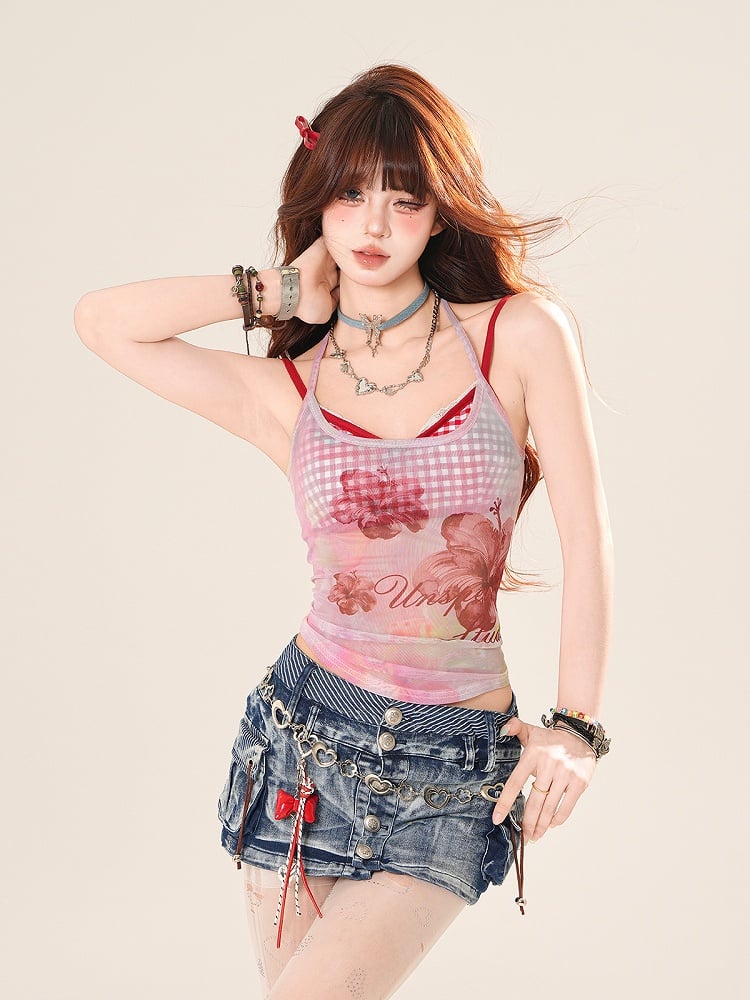 ピンク/ブルーの花柄セミシースルーホルターネックトップスとレッドチェック柄キャミソールセット
