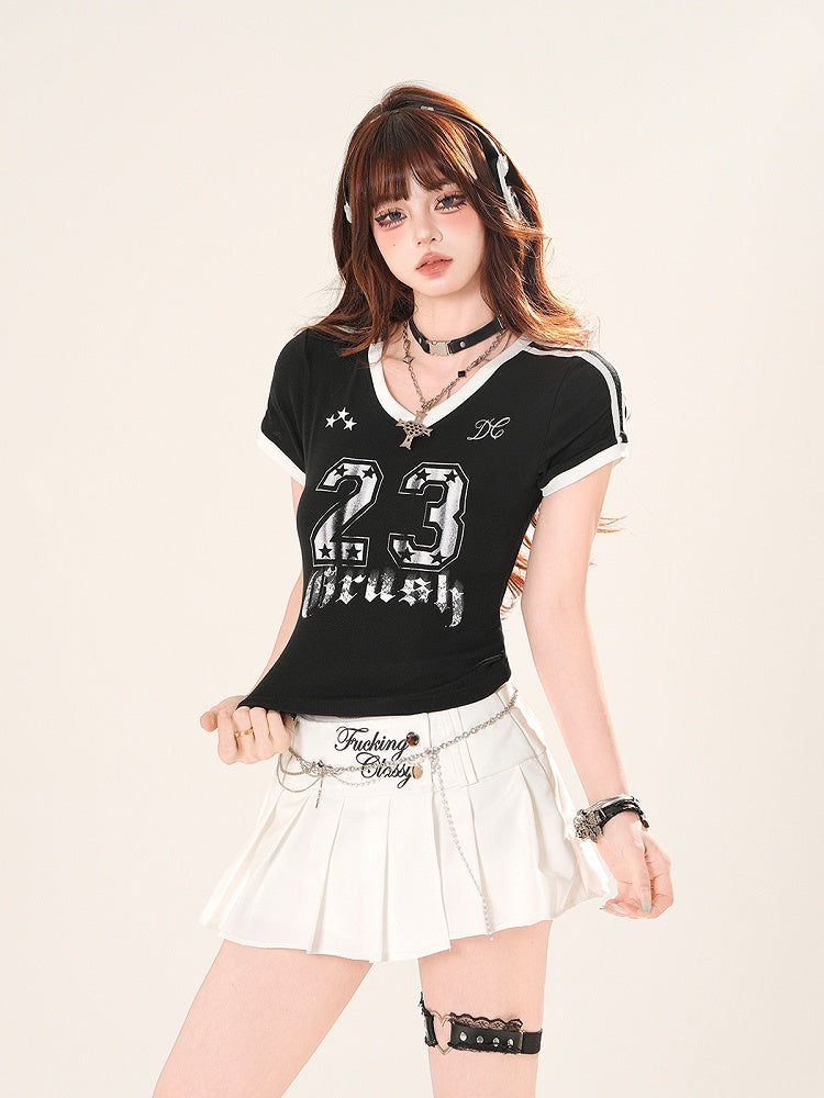 ピンク/ブルー/ブラック ブロケット コア ナンバープリント Vネック Tシャツ