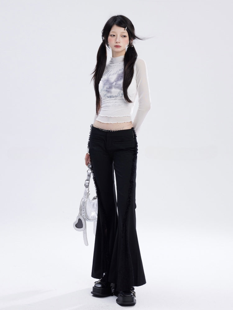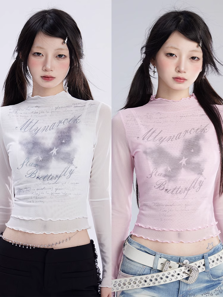 ピンク/ホワイトのセミシースルートップス、バタフライプリント、レタスヘムメッシュ